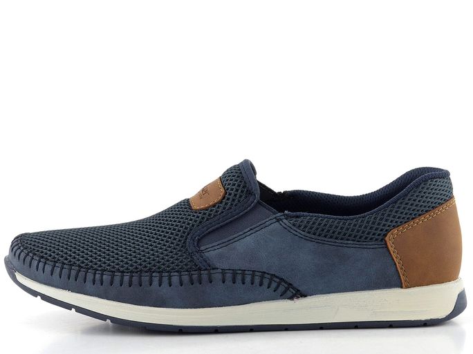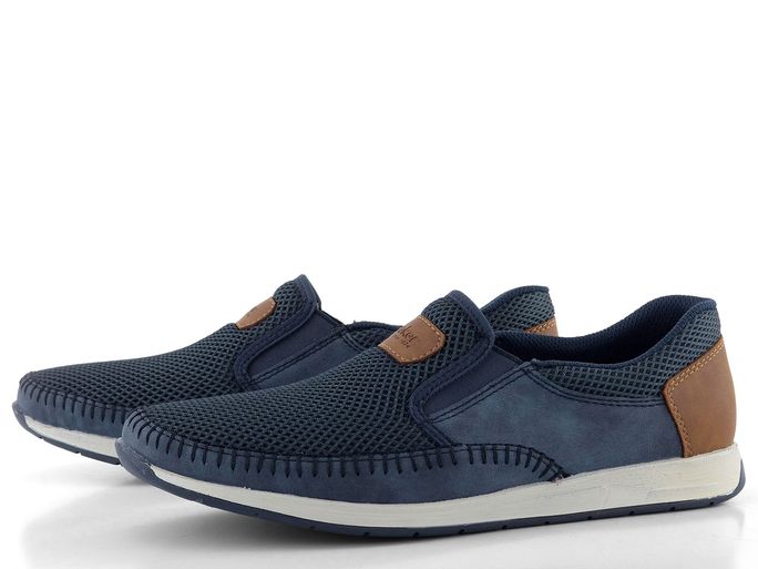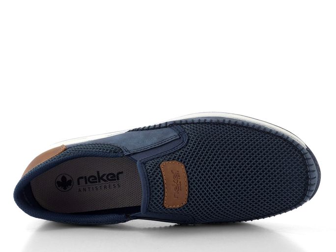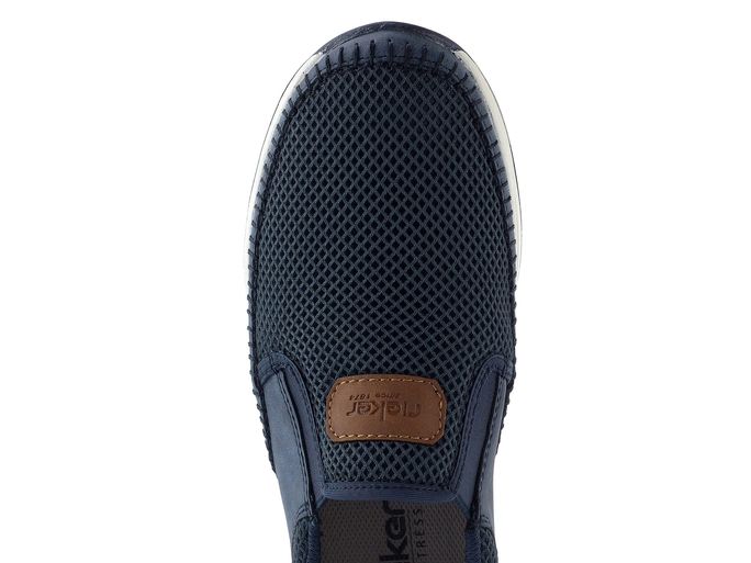 Pánské nazouvací polobotky od značky Rieker jsou ideálním společníkem pro jarní a letní dny. Styl mokasín v tmavě modré barvě s elegantními světle hnědými detaily dodává na atraktivitě. Svršek je vyroben z kombinace hladké syntetiky a prodyšné textilie, což zajišťuje pohodlí po celý den. Pružné vsadky na nártu usnadňují obutí a polstrovaný patní lem poskytuje dodatečný komfort. Uvnitř se nachází měkká vyjímatelná vložka s textilním potahem, která podporuje zdravý krok. Lehká a ohebná syntetická podešev je ideální pro městské procházky i formální příležitosti. Vybavte se kvalitním kouskem, který spojuje styl a pohodlí.