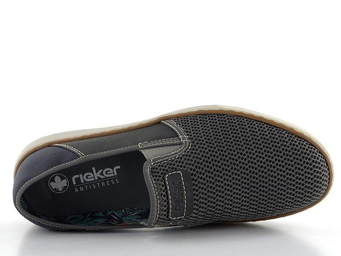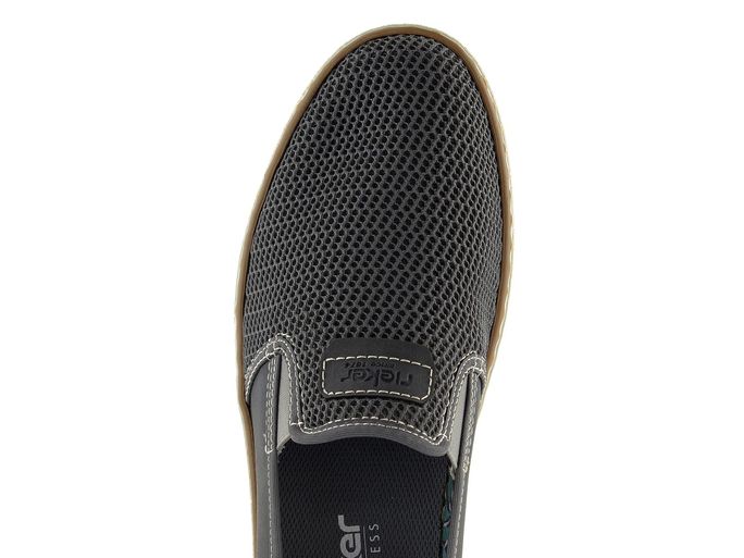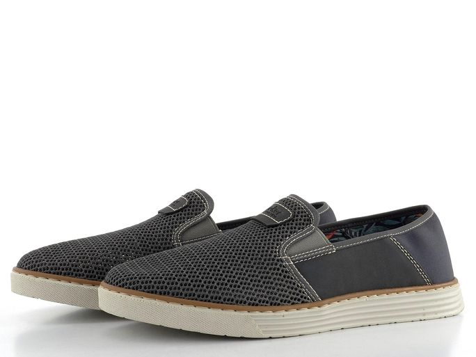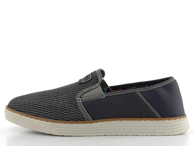 Představujeme pánské letní polobotky od značky Rieker v elegantním tmavě šedém provedení, které spojují komfort a styl. Tyto prozouvací mokasíny s kulatým střihem jsou vyrobeny z kombinace matné syntetiky, softshellové textilie a prodyšné síťoviny, což zajišťuje optimální odvětrávání chodidla. Díky dvěma pruženkám po stranách je obutí a nošení snadné a pohodlné. Softshellový materiál na patě umožňuje krátkodobé nošení jako nazouvák. Extra měkká textilní stélka a lehká flexibilní podešev zaručují pohodlí při každém kroku. Tyto boty jsou ideální volbou pro muže, kteří hledají stylovou a praktickou obuv pro jarní a letní sezónu.