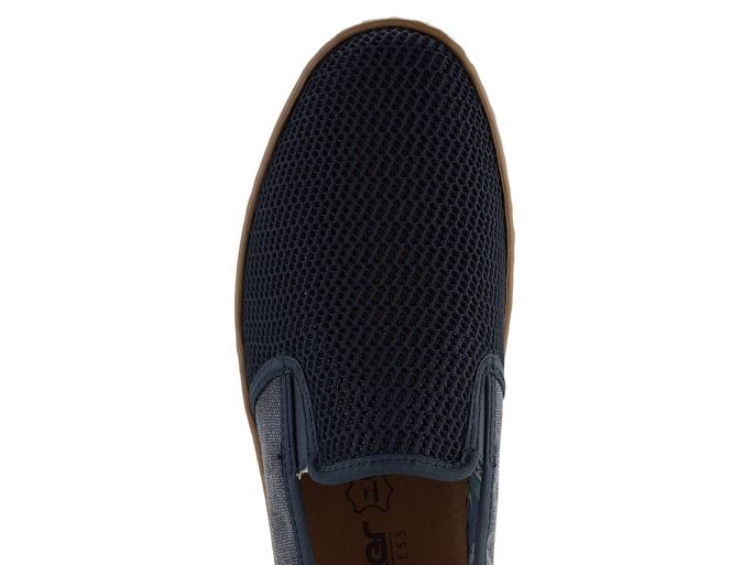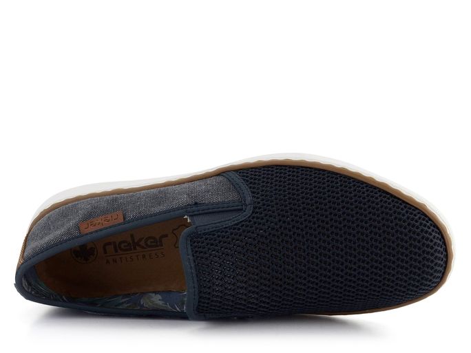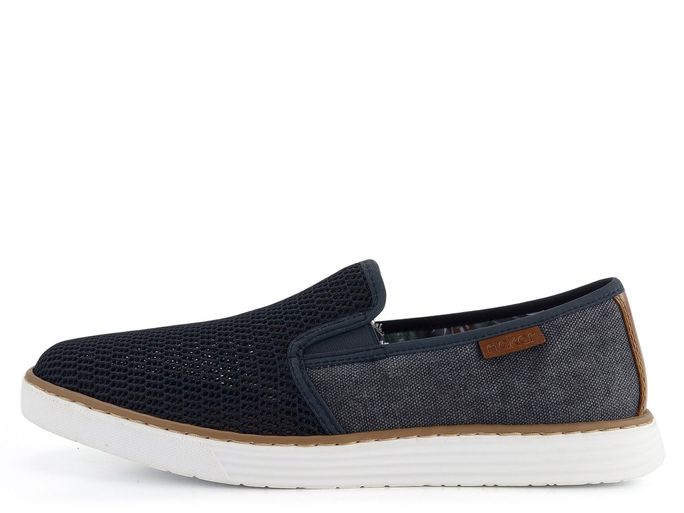 Pánské letní prozouvací polobotky od značky Rieker v tmavě modré barvě jsou ideální volbou pro muže, kteří hledají pohodlí a styl. Tyto boty kombinují pevnou plátnovinu s prodyšnou síťovinou, což zajišťuje optimální ventilaci a komfort během teplých dnů. Patní díl je z kvalitního syntetického materiálu, zatímco vnitřní podšívka je textilní, což přispívá k celkovému pohodlí při nošení. Extra měkká kožená stélka zajišťuje maximální pohodlí při každém kroku. Dvě pruženky po stranách usnadňují obouvání a zajišťují lepší přizpůsobení noze. Flexibilní syntetická podešev v kontrastní bílé barvě dodává botám moderní vzhled a zajišťuje stabilitu. Tmavě modrá a tmavošedá barva s hnědými doplňky dodávají botám elegantní a univerzální vzhled, který se hodí jak do města, tak na lehkou procházku. Vyberte si kvalitu a komfort s těmito stylovými polobotkami od značky Rieker.