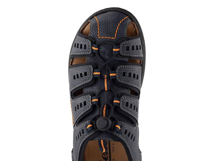 Temně modrý odstín je doplněn černými a oranžovými detaily, které dodávají sandálům moderní vzhled. Na nártu najdete pružné šněrování se stahováním na olivku, což umožňuje snadné a rychlé přizpůsobení. Softshellová textilie z rubové strany je polstrovaná a příjemná k chodidlu, což zvyšuje celkový komfort při nošení.