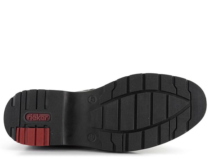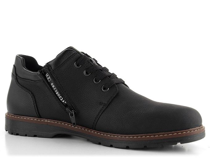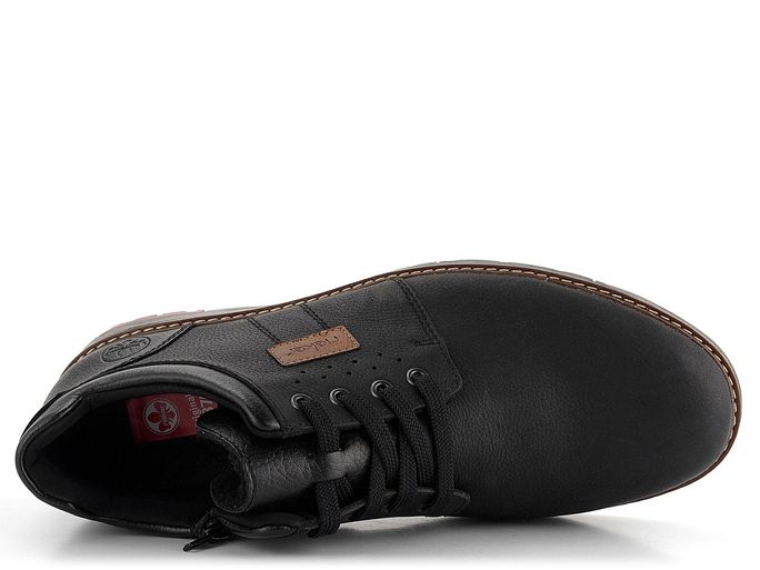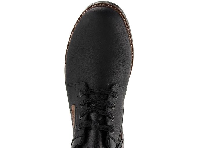 Pánské nízké kotníkové boty od značky Rieker jsou ideální volbou pro podzimní a zimní sezónu. Tyto vyšší polobotky v černé barvě kombinují jednoduchý design s maximálním pohodlím. Svršek z přirozeně strukturované kůže s maštěnou úpravou zajišťuje elegantní vzhled, zatímco obvodový lem, jazyk a pata z hladké syntetiky dodávají botám moderní nádech. Kulatý, prostorný tvar špičky a šněrování umožňují regulaci šíře obuvi, zatímco zip na vnitřní straně usnadňuje obutí. Kotník je vyteplený hustou textilní střiží, což zajišťuje teplo a komfort i v chladných dnech. Extra měkká stélka potažená filcem a vyměkčená obvodová i patní část poskytují pohodlí při každém kroku. Latexová podešev s protismykovým dezénem a široký podpatek zajišťují stabilitu a bezpečí na různých površích. Výška obuvi (bez podpatku) je 8 cm. Tento model je vyroben lepeným způsobem, což zaručuje dlouhou životnost a odolnost.