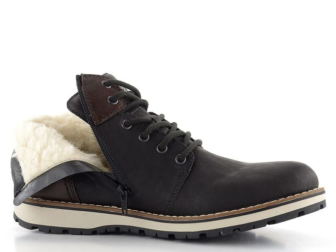 Pánský vyteplený kotník od značky Rieker je ideální volbou pro podzimní a zimní sezónu. Nabízí prostorný kulatý střih a svršek z jemně strukturované syntetiky a textilie, což zajišťuje pohodlí a odolnost. V černé barvě s tmavě hnědými doplňky a melírovanou bandáží vypadá elegantně a moderně.