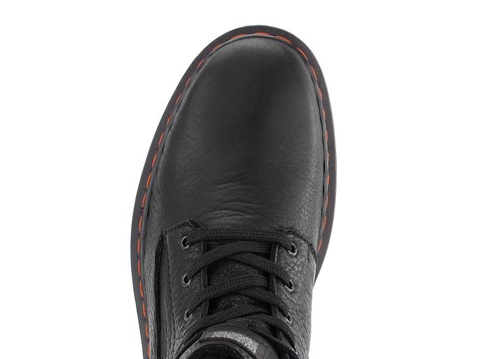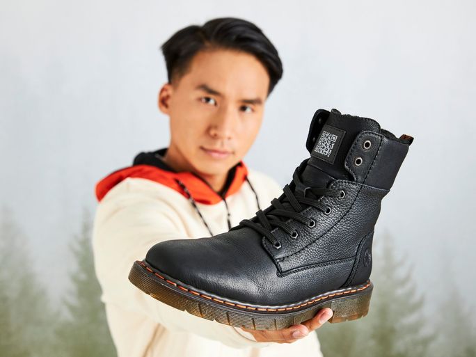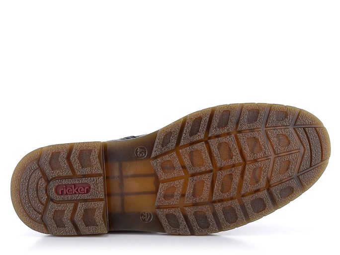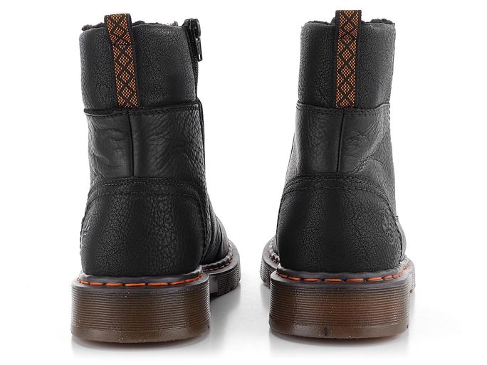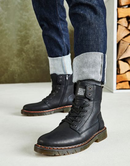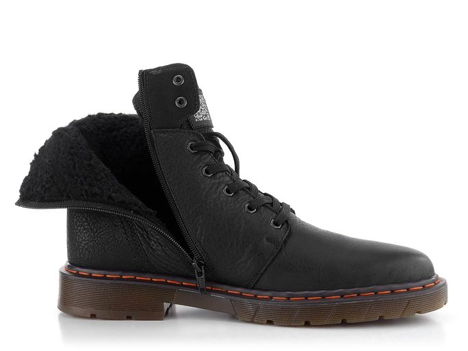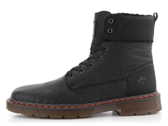 Stylové a robustní pánské kotníkové boty od značky Rieker jsou ideální volbou pro podzimní a zimní sezónu. Tyto vyšší uzavřené boty v černé barvě s oranžovými detaily se vyznačují vysokým střihem na šněrování a praktickým postranním zipem. Svršek bot je vyroben ze strukturované kůže s maštěnou úpravou, což zajišťuje odolnost a snadnou údržbu. Horní lem a patní část jsou ze syntetického materiálu, což přispívá k delší životnosti. Vnitřek bot je vyplněn umělou kožešinkou, která zajišťuje teplo, a extra měkkou stélkou potaženou filcem pro maximální pohodlí. Bytelná latexová podešev zaručuje dobrou stabilitu. Výška kotníku je 15 cm (bez podešve). Boty jsou vyrobeny šitým způsobem, což poskytuje vysokou flexibilitu a pohodlí. Pro zvýšení odolnosti vůči vlhku doporučujeme použít vhodné impregnační přípravky.