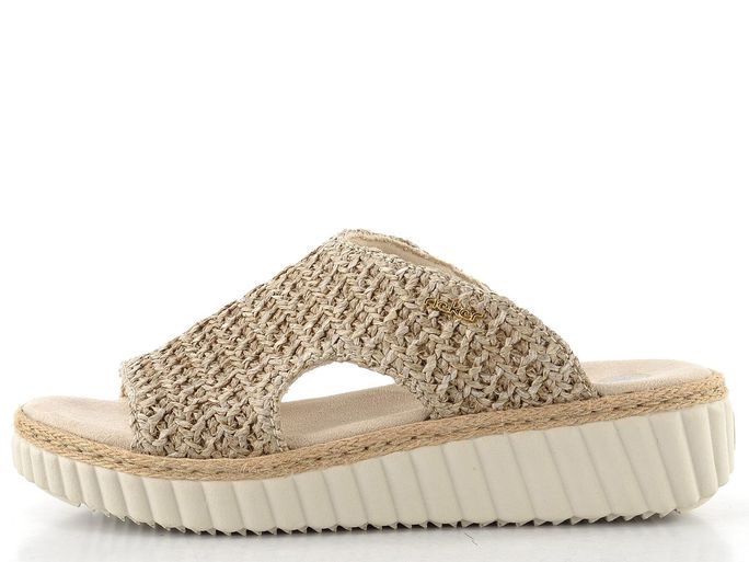 Dámské pantofle na klínku od značky Rieker představují ideální volbu pro jarní a letní dny. Tyto pohodlné a stylové boty jsou navrženy v širším střihu H, což je perfektní pro ženy s širšími chodidly. Vrchový dílec je vyroben ze splétaného umělého lýka v přírodních béžových tónech, což dodává botám elegantní vzhled.