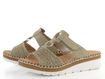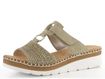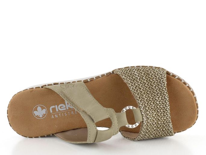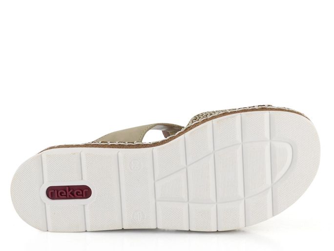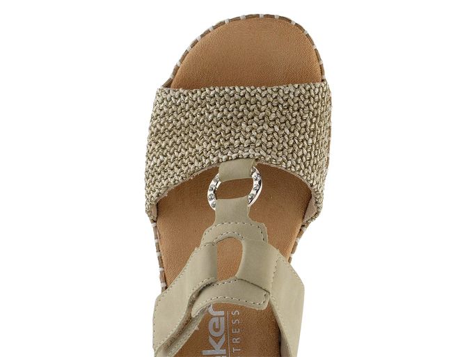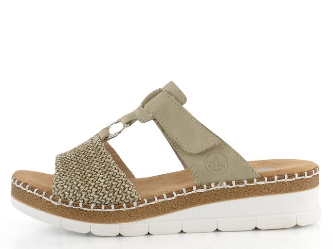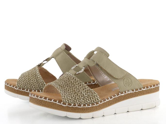 Dámské pantofle značky Rieker na platformě jsou ideální volbou pro ty, kdo hledají pohodlí a styl. Vynikají komfortním kulatým střihem a světle zelenou barvou s jemným zelenošedým nádechem. Pásky jsou vyrobeny z kombinace matné syntetiky a splétaného umělého lýka, což dodává pantoflím jedinečný vzhled. Přední pásek je celý ze splétaného lýka a je spojen s nártovým páskem pomocí kovového kroužku s čirými štrasovými kamínky. Nártový pásek je navíc upínaný na suchý zip, což zajišťuje snadné obouvání. Extra měkká stélka potažená broušenou textilií poskytuje maximální pohodlí při nošení. Tyto pantofle s výškou podpatku 4,5 cm a syntetickou podešví s hrubším vzorkem jsou ideální volbou pro jarní a letní sezónu.