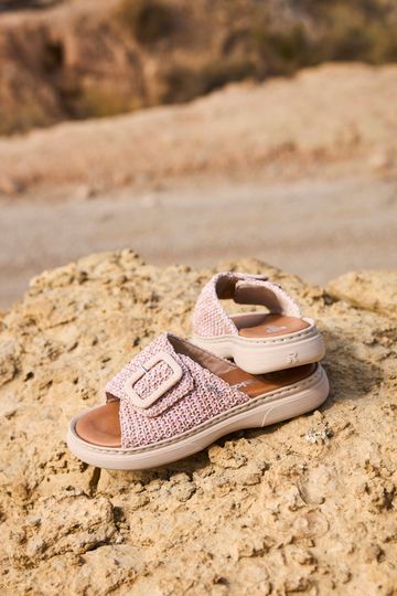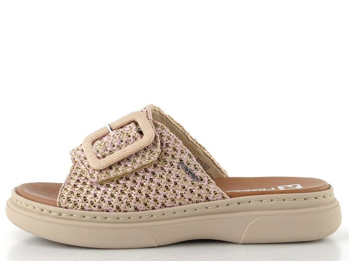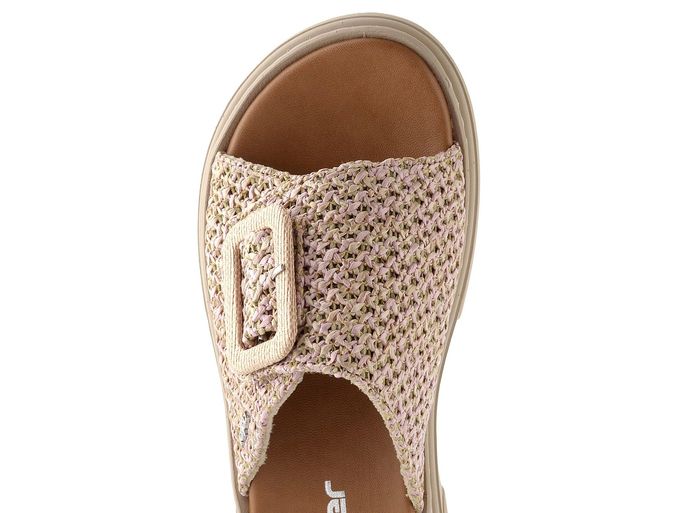 Dámské pantofle Rieker se sponou v trendy kombinaci růžové a béžové barvy jsou ideální volbou pro jarní a letní dny. S jejich kulatou špičkou a páskem vyrobeným ze splétaného umělého lýka se budete cítit pohodlně a stylově. Velká ozdobná spona, pod kterou se skrývá zapínání na suchý zip, zajišťuje snadné obouvání a dokonalé přizpůsobení. Vnitřní strana pásku je z měkce podložené broušené textilie, což přispívá k celkovému komfortu. Měkčená stélka potažená hladkou syntetikou a lehká podešev s hrubým vzorkem vám poskytnou stabilitu při každém kroku. Tyto pantofle jsou šité a lepené, což zaručuje jejich trvanlivost a kvalitu.