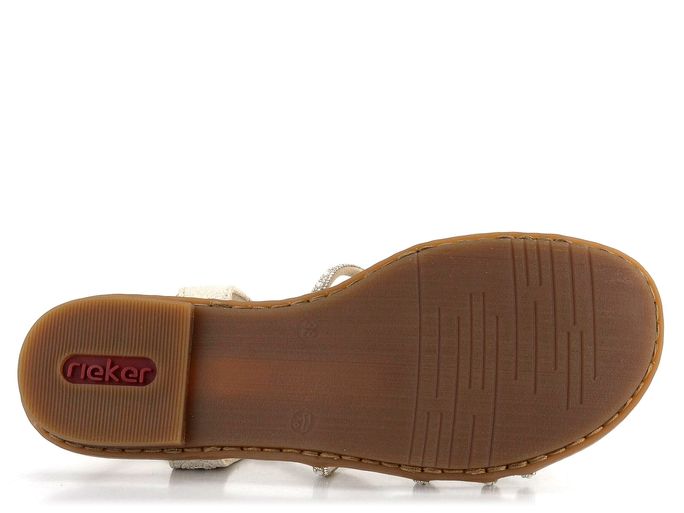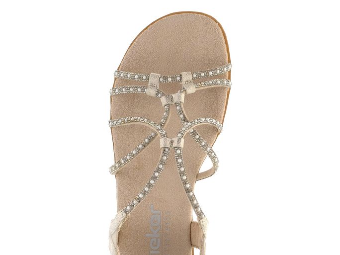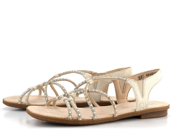 Elegantní dámské sandály od značky Rieker jsou ideální volbou pro jarní a letní sezónu. Tyto páskové boty v béžové barvě se zlatými metalickými odlesky nabízejí nejen styl, ale i pohodlí. Blyštivé pásky zdobené štrasovými kamínky a béžovými korálky dodávají obuvi luxusní vzhled. Díky kotníkovému pásku se všitými pruženkami je obutí snadné a rychlé. Svršek je vyroben ze syntetiky, zatímco vnitřní strana pásků je také syntetická, s patním páskem podšitým textilií. Měkká stélka potažená savou textilií zaručuje komfort při každém kroku. Flexibilní latexová podešev s nízkým podpatečkem (1,8 cm) a šitý výrobní způsob zajišťují dlouhou životnost a pohodlí. Tyto sandály jsou perfektní volbou pro každodenní nošení do města i na lehkou procházku.