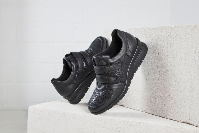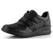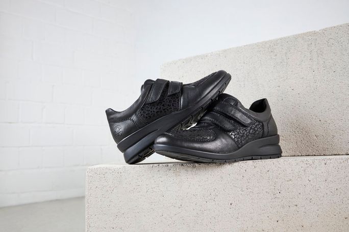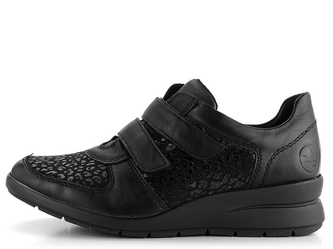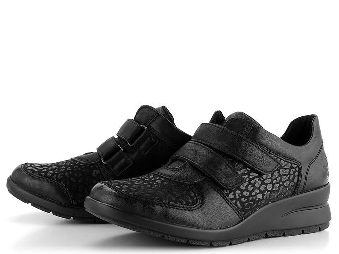 Extra komfortní dámské polobotky na suchý zip od značky Rieker jsou ideální volbou pro podzimní a zimní sezónu. Tyto polobotky se pyšní prostornou kulatou špičkou, která díky strečovému materiálu ve špičce poskytuje pohodlí i pro mírně širší chodidla a citlivé kloubky. Kombinace hladké kůže a pružné textilie v černé barvě s jemným lesklým potiskem na textilních dílech dodává botám elegantní vzhled.
