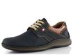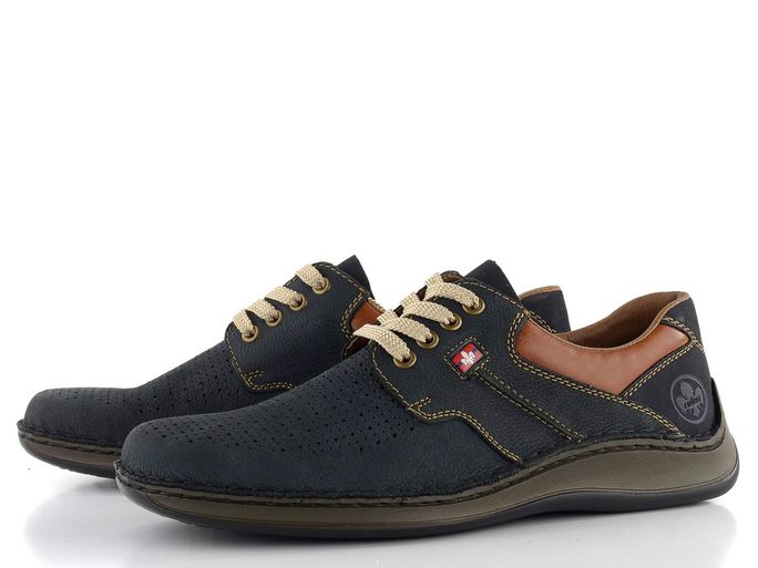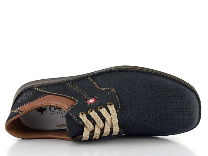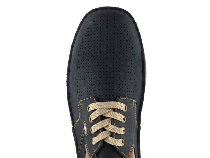 Širší pánské polobotky značky Rieker jsou ideální volbou pro jarní a letní sezónu. Tyto polobotky se vyznačují hranatějším tvarem špičky, který je výrobcem deklarován jako Extra Weit, což zajišťuje pohodlí pro širší typ chodidel. Svršek je vyroben z kvalitní nubukové kůže a syntetiky, přičemž špička má perforovaný vzor, který není z rubové strany podšitý, což přispívá k lepší prodyšnosti. Boty mají tmavě modrou barvu s béžovými a koňakovými prvky, což jim dodává stylový vzhled. Podšívka kombinuje netkanou textilii a hladkou syntetiku, zatímco měkká stélka potažená kůží poskytuje maximální komfort. Shora šitý svršek na syntetickou podešev zajišťuje výjimečnou flexibilitu těchto polobotek.