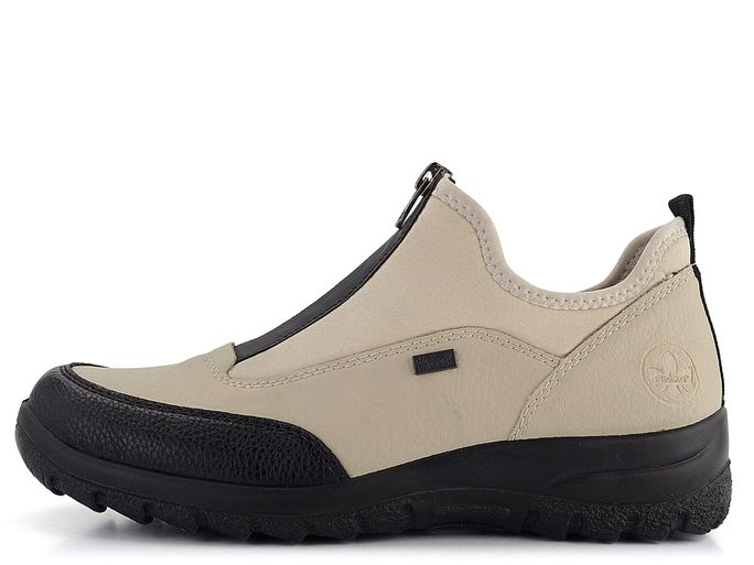 Dámské polobotky značky Rieker jsou ideální volbou pro podzimní a zimní sezónu. Díky kombinaci strukturované syntetiky a pružné softshellové textilie poskytují pohodlí a odolnost. Světle béžová barva s černými doplňky dodává botám moderní vzhled, který se hodí k různým outfitům.