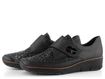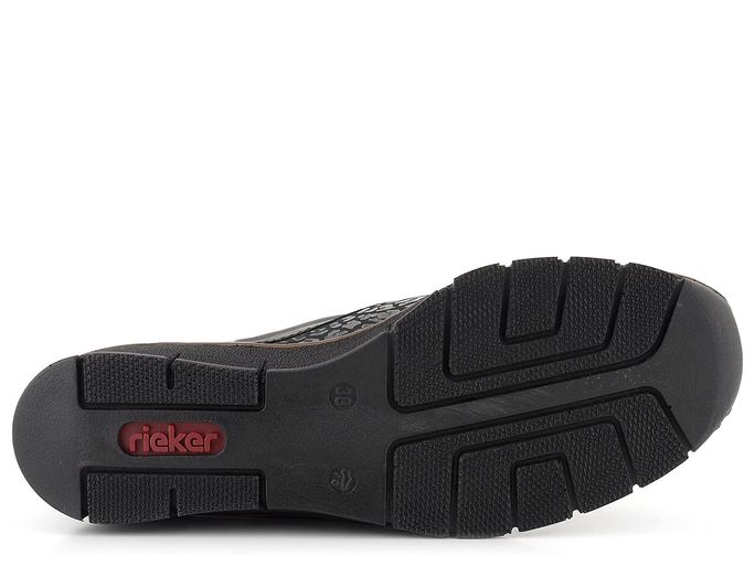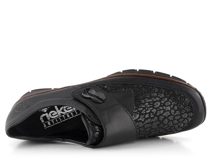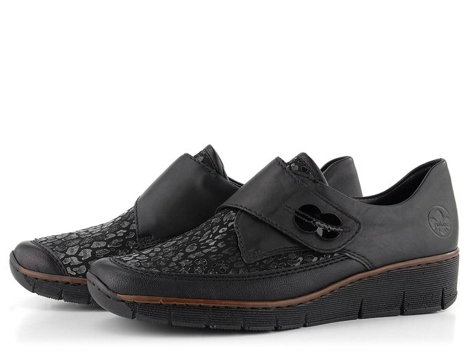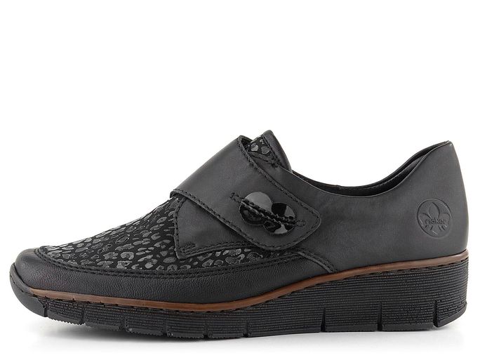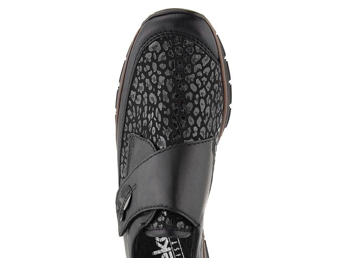 Dámské pohodlné polobotky na klínu od značky Rieker jsou ideální volbou pro chladnější období podzimu a zimy. Díky prostornému tvaru špičky a kombinaci hladké kůže s poddajnou softshellovou textilií poskytují mimořádný komfort. Softshellový materiál zajišťuje pružnost, což činí obuv vhodnou pro širší chodidla a kloubky. Textilie je navíc potištěna lesklým "zvířecím" vzorem, který dodává botám elegantní vzhled. Široký pásek na suchý zip usnadňuje obouvání a zajišťuje pevné držení nohy. Podšívka z hladké syntetiky a textilie spolu s měkkou koženou stélkou zaručují pohodlí po celý den. Flexibilní a lehká podešev na klínu s výškou podpatku 3,4 cm poskytuje stabilitu a pohodlí při chůzi. Boty jsou vyrobeny šitým výrobním způsobem, což zvyšuje jejich flexibilitu, avšak doporučujeme je používat především v suchém prostředí a ošetřovat vhodnými impregnačními přípravky.