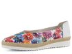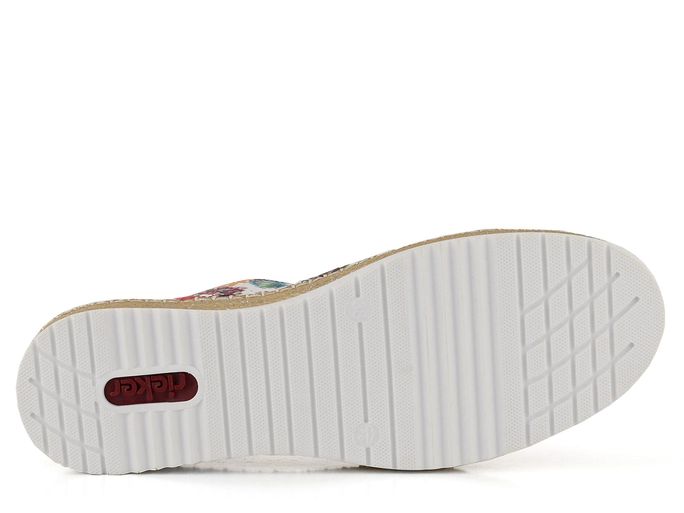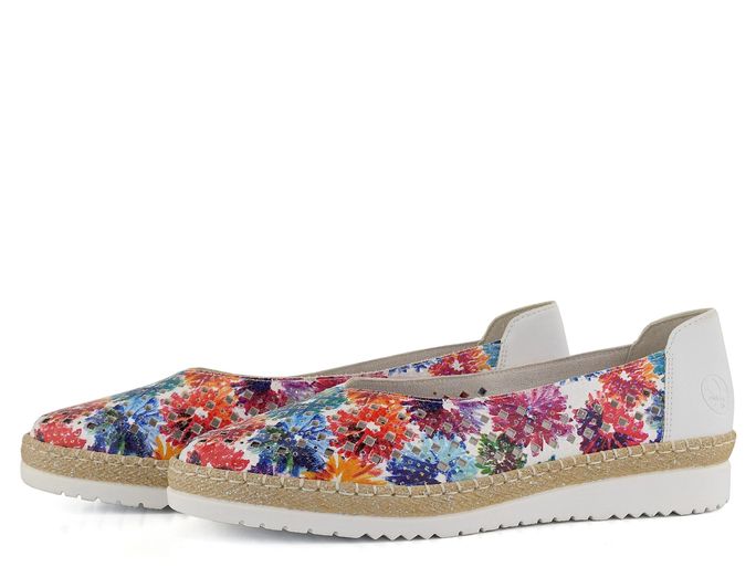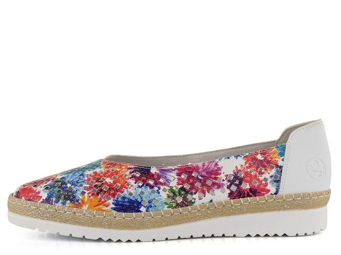 Dámské baleríny od značky Rieker nabízejí nejen komfort, ale i stylový vzhled. Tyto boty mají kulatou špičku a svršek z hladké syntetiky s pestrobarevným květinovým potiskem na bílém základu, který zahrnuje barvy jako modrá, růžová, červená, zelená a oranžová. Jemný metalický odlesk dodává botám elegantní nádech. Vzdušná perforace po celé ploše zajišťuje maximální prodyšnost, což oceníte zejména během teplejších měsíců. Podšívka z broušené textilie a velmi měkká kožená stélka přinášejí pohodlí při každém kroku. Zvýšený a zpevněný opatek spolu s dvoubarevnou podešví a výškou podpatku 3,3 cm zajišťují stabilitu a elegantní vzhled. Výrobní způsob šití garantuje dlouhou životnost a kvalitu. Ideální volba pro ženy, které hledají stylovou a komfortní obuv na jaro a léto.