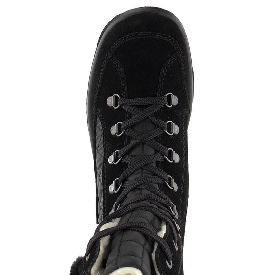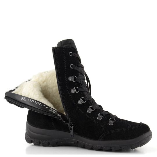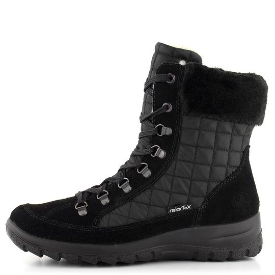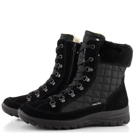 Stylové dámské kotníkové boty od značky Rieker jsou ideální volbou do chladných zimních dnů. Tyto boty kombinují velurovou kůži a prošívanou textilii v elegantní černé barvě. Mají pěknou kulatou špičku a jsou vybaveny silně polstrovaným kotníkovým lemem s kožešinkou. Pro snadné obutí slouží zip na vnitřní straně a šněrování s kovovými očky na ploché tkanice.