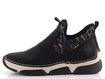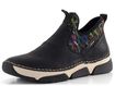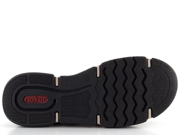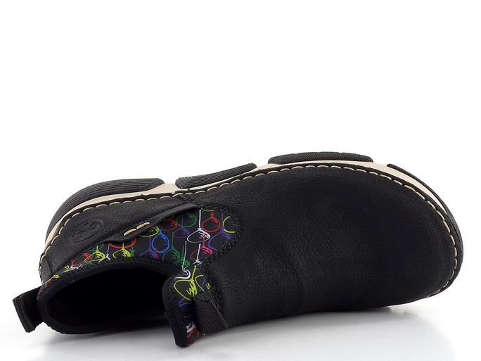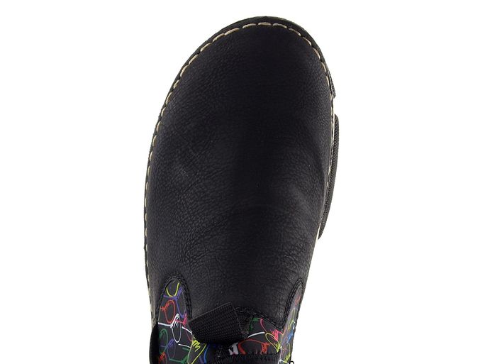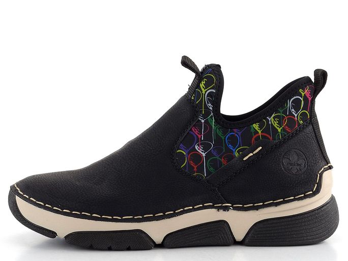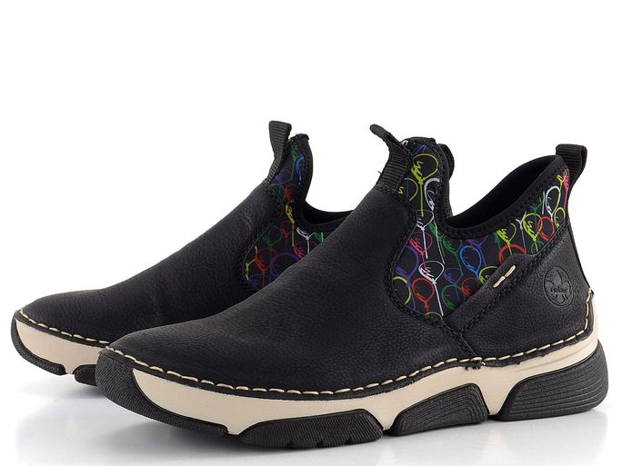Dámský prozouvací kotník na platformě od značky Rieker je ideální volbou pro podzimní a zimní sezónu. Boty vynikají prostorným, kulatým střihem a kombinací syntetického materiálu s pružnou softshellovou textilií. Černá barva je doplněna barevným potiskem v lemu, což dodává obuvi elegantní vzhled.