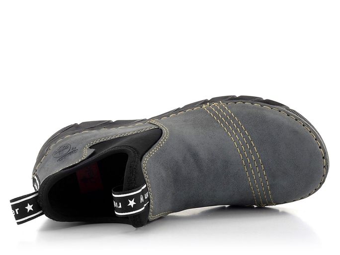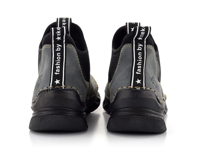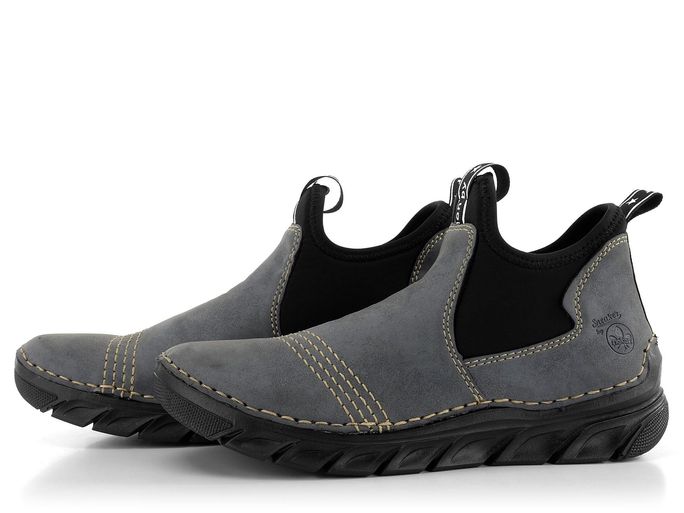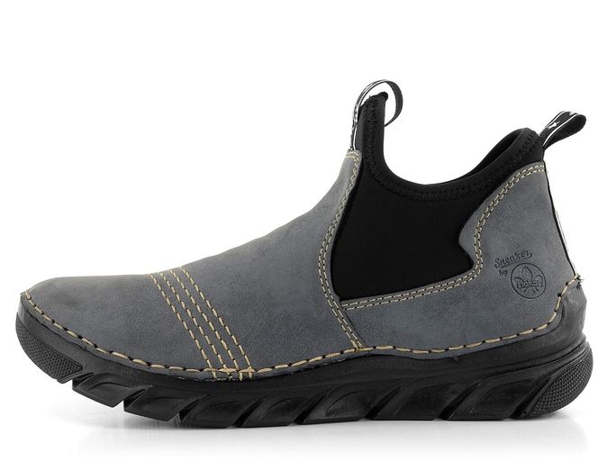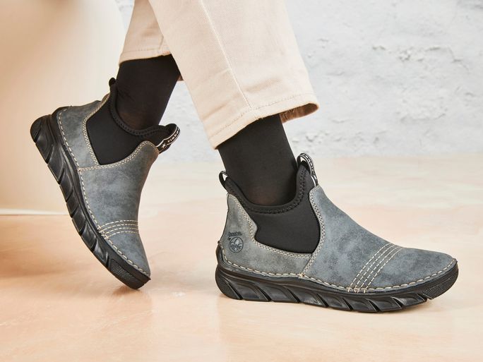 Ležérní dámské kotníkové boty od značky Rieker jsou ideální volbou pro podzimní a zimní sezónu. Tyto boty vynikají svým prostorným, kulatým střihem a širokými pružnými vsadkami na obou stranách, které usnadňují nazouvání. Vyrobené ze syntetického materiálu v elegantním šedomodrém odstínu, doplněné černou podešví a vsadkami, zaujmou i svým ozdobným štepováním a kontrastním černobílým proužkem s nápisem "fashion by rieker". Textilní podšívka a měkká filcová stélka zajišťují maximální pohodlí, zatímco flexibilní podešev přináší skvělou přizpůsobivost a komfort při chůzi. Boty jsou vyrobeny šitým způsobem, což zajišťuje pohodlí a flexibilitu, avšak nezaručuje vodotěsnost. Pro zvýšení odolnosti vůči vlhku doporučujeme použít vhodné impregnační přípravky. Výška podpatku je 3,5 cm, což poskytuje dostatečnou stabilitu i styl. Tyto boty jsou ideální pro každodenní nošení ve městě i na lehké procházky venku.