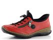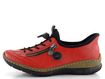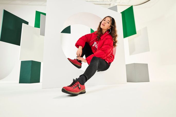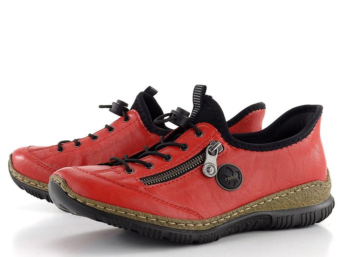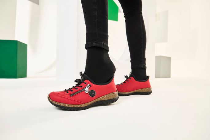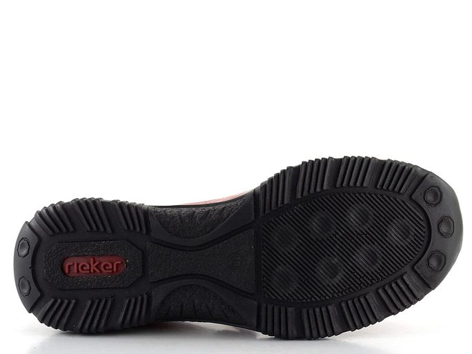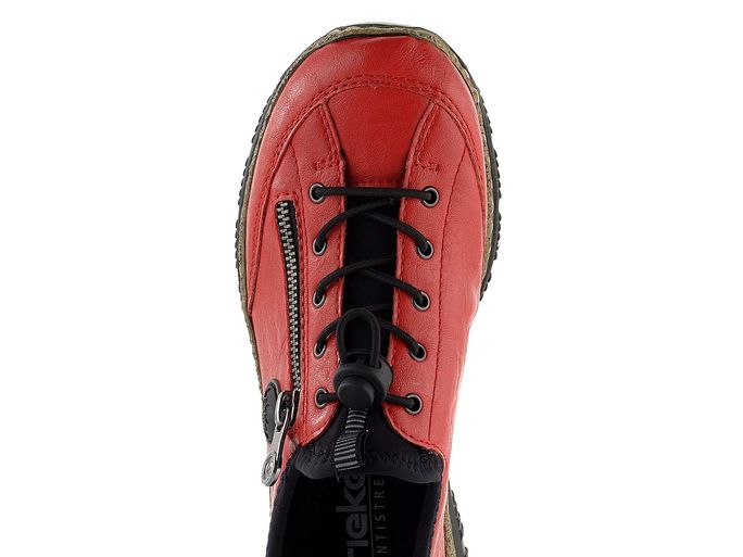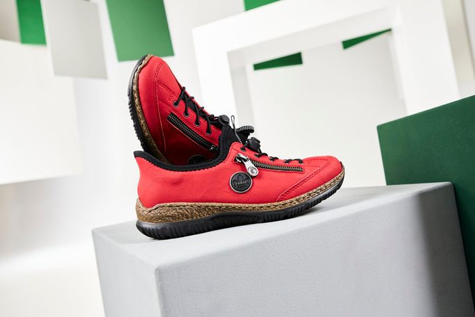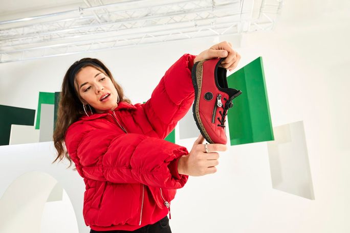 Dámské polobotky značky Rieker jsou ideální volbou pro podzimní a zimní sezónu. Vynikají ležérním prozouvacím střihem s kulatou špičkou a karmínově červeným svrškem ze syntetiky s jemnou mačkanou strukturou. Na nártu se nachází pružná gumička s možností utažení a ozdobný zip. Pro snadné prozutí je na lemu obuvi použita strečová textilie.