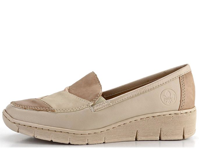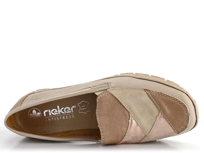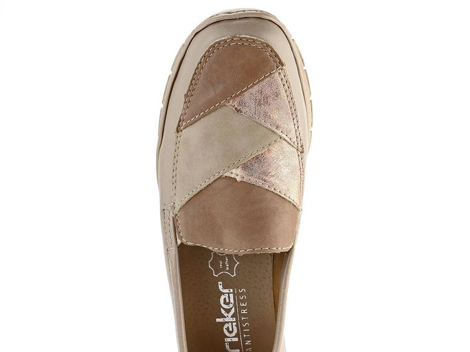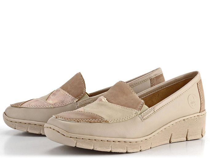 Objevte pohodlí a eleganci s dámskými koženými polobotkami na klínu od značky Rieker. Tyto boty jsou ideální volbou pro jarní a letní sezónu, kdy oceníte jejich lehkost a komfort. Svršek je vyroben z povrstvené kůže a syntetiky, což zajišťuje dlouhou životnost a odolnost. Hranatější špička a příjemná kombinace béžových a růžových metalických odstínů dodávají botám moderní vzhled.
