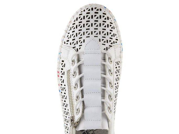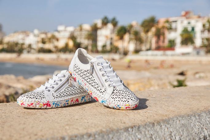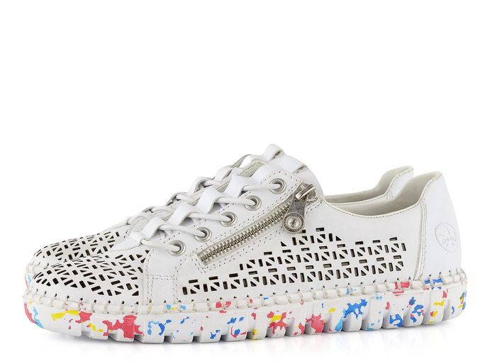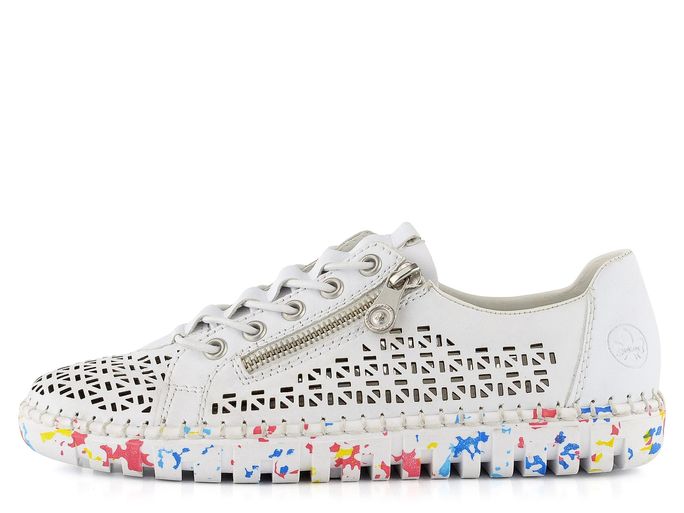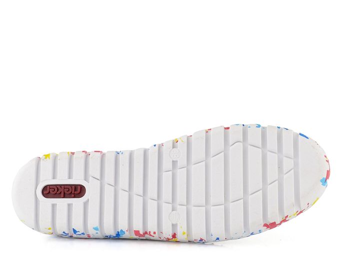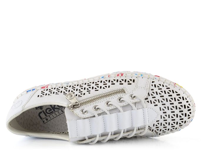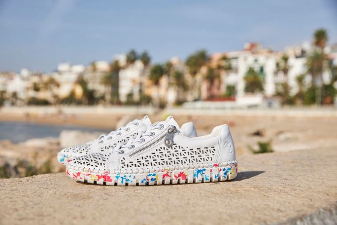 Letní dámské polobotky značky Rieker kombinují styl a pohodlí. Díky prořezávanému vzoru na téměř celé ploše jsou mimořádně vzdušné, což oceníte během teplých dnů. Svršek bot je z kombinace kůže a syntetiky, což zaručuje jejich odolnost a elegantní vzhled. Prostorná kulatá špička poskytuje dostatek místa pro prsty, zatímco extra měkká kožená stélka zajišťuje maximální komfort při chůzi. Velmi ohebná latexová podešev s originálním barevným potiskem dodává botám jedinečný vzhled a zároveň zvyšuje jejich flexibilitu. Funkční šněrování doplněné o krátký postranní zip usnadňuje obouvání. S výškou podpatku 2,5 cm jsou ideální pro každodenní nošení. Tyto polobotky jsou skvělou volbou pro ženy, které hledají stylovou a pohodlnou obuv na jaro a léto.
