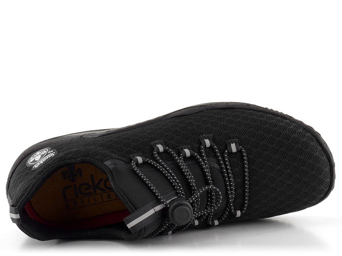 Lehké a komfortní dámské vycházkové tenisky bez zavazování od značky Rieker jsou ideální volbou pro každodenní nošení. Díky prostorné kulaté špičce a prodyšnému svršku z měkké textilie poskytují maximální pohodlí. Gumičková šněrovadla lze snadno dotáhnout olivkou, což zajišťuje rychlé a snadné obutí. Reflexní prvky zvyšují bezpečnost při chůzi za snížené viditelnosti. Měkká vyjímatelná stélka s textilním potahem a pružný lem obuvi přispívají k příjemné chůzi. Flexibilní podešev a šitý výrobní způsob zajišťují pohodlí, i když není obuv vodotěsná. Doporučujeme používat v suchém prostředí.