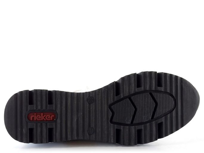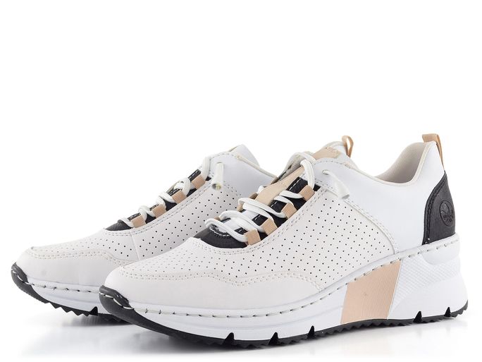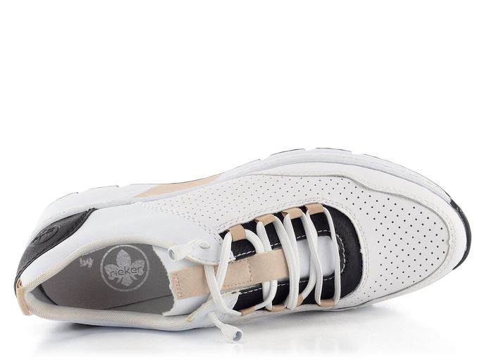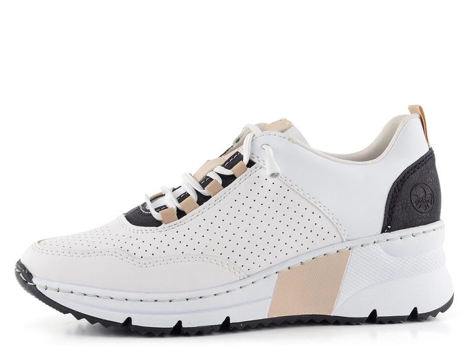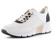 Stylové a pohodlné dámské tenisky na klínku od značky Rieker jsou ideální volbou pro jarní a letní sezónu. Tyto tenisky vynikají sportovnějším prozouvacím střihem a lehkostí, která je příjemná na noze. Kombinace hladké povrstvené kůže a syntetiky v bílém provedení s černými a pudrově růžovými doplňky dodává botám moderní vzhled.