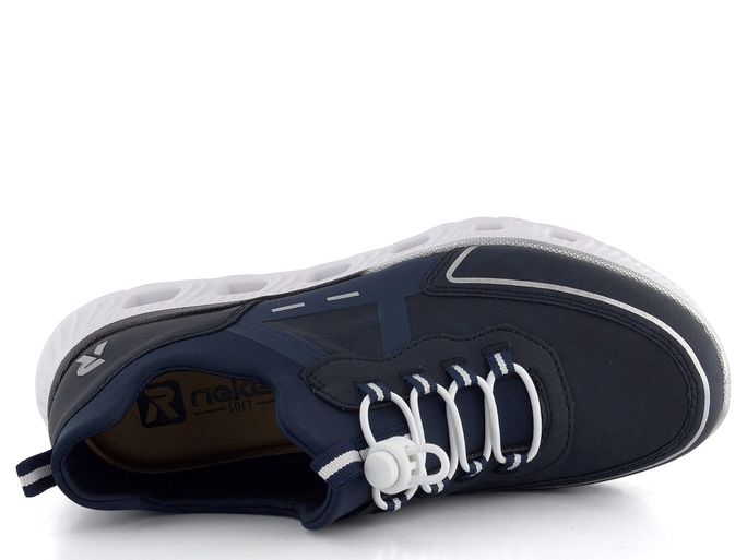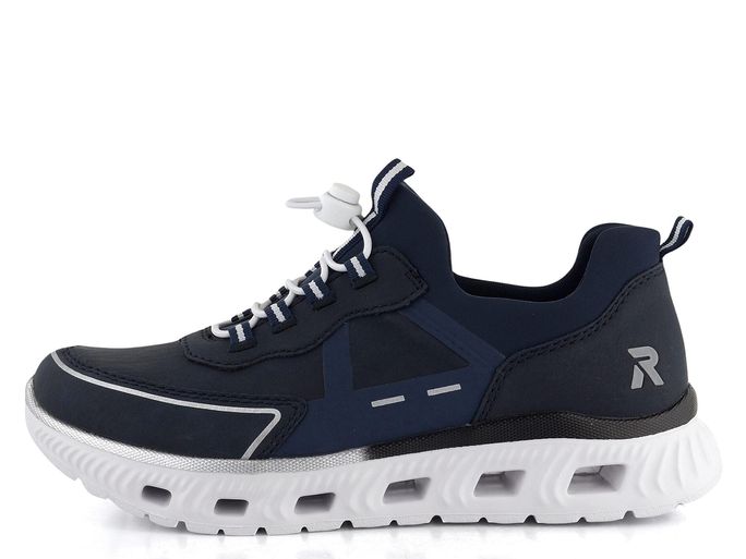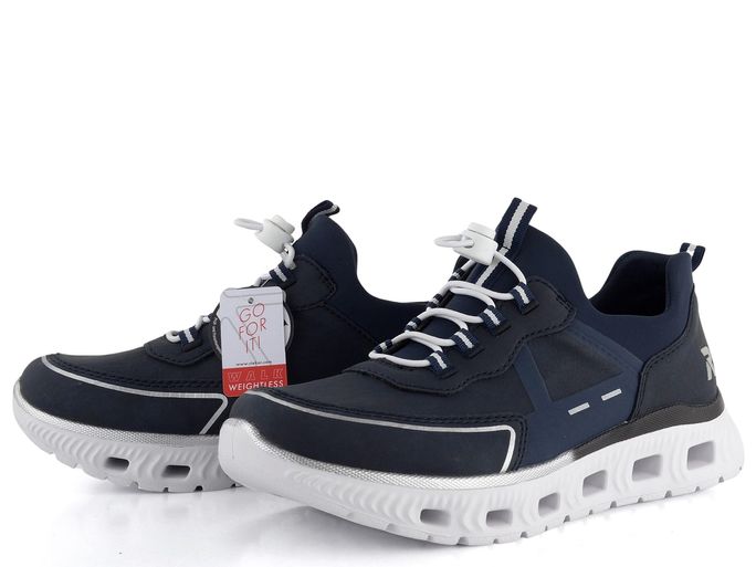 Lehké a komfortní dámské tenisky od značky Rieker představují ideální volbu pro ty, kdo hledají stylový a pohodlný kousek pro každodenní nošení. Tyto tenisky bez zavazování jsou součástí volnočasové kolekce Sport&Style a vynikají svým moderním designem a praktičností. 100% veganská obuv je vyrobena z kombinace softshellové textilie a matné syntetiky v temně modrých odstínech, doplněných bílými a stříbrnými detaily. Měkký a pružný kotníkový lem zajišťuje snadné obutí, zatímco extra měkká stélka z paměťové pěny poskytuje maximální komfort při chůzi. Díky reflexním prvkům a odlehčené sportovní podešvi s komorami jsou tyto tenisky nejen stylové, ale i funkční.