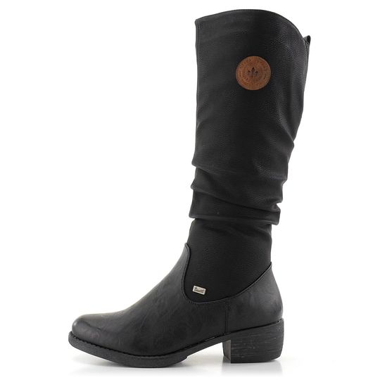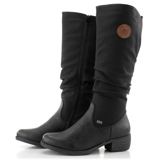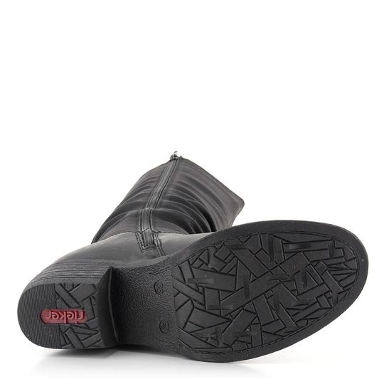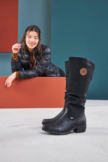 Dámské vyteplené kozačky vybavené vodoodpudivou membránou riekerTEX a na vyšší podešvi se širokým podpatkem.