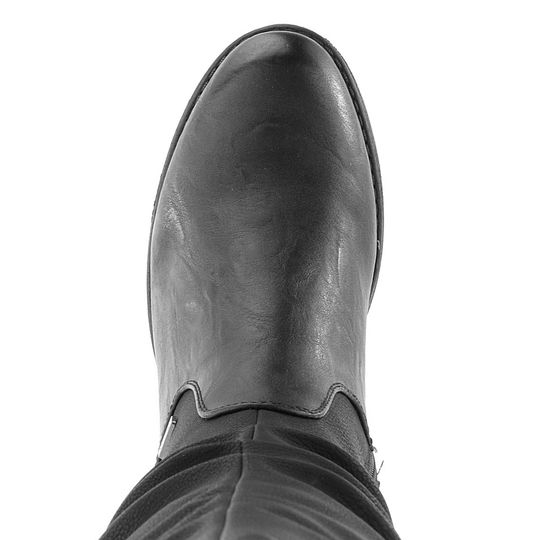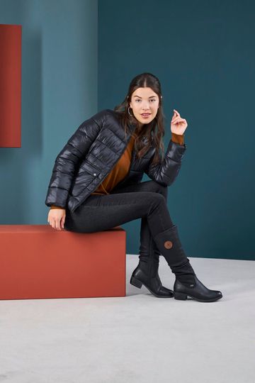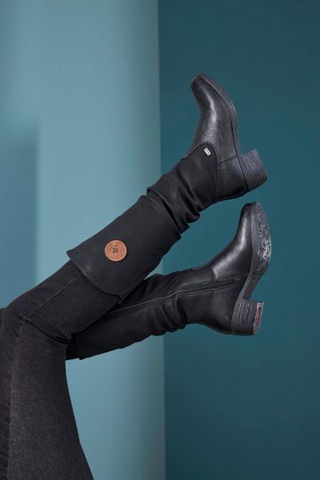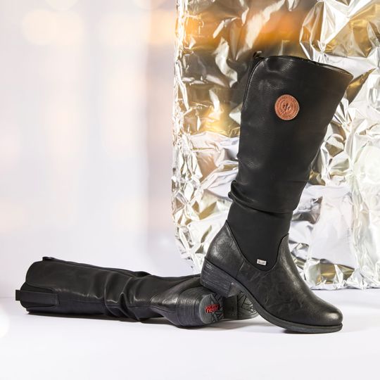 Lehce nedbalá elegance a pohodlí se setkávají v těchto osobitých kozačkách od značky Rieker. Vyrobeny z kombinace lesklé a matné syntetiky, tyto černé kozačky s módním řasením se hodí do každého šatníku. Díky pružině v horní lýtkové části a postrannímu zipu je zajištěn skvělý fitting a snadné obutí. Uvnitř vás zahřeje hustá podšívka ze střiže a filcová stélka.