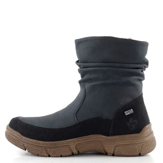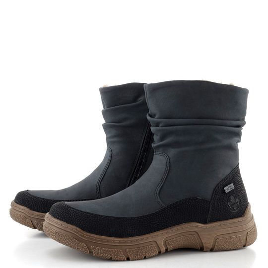 Dámský kotník od značky Rieker je ideální volbou pro chladné podzimní a zimní dny. Jeho kulatý a prostorný tvar špičky zajišťuje pohodlí i pro širší chodidla. Vyrobený z matné a strukturované syntetiky v atraktivní tmavě modré barvě s černými detaily, tento model se snadno kombinuje s různými outfity.