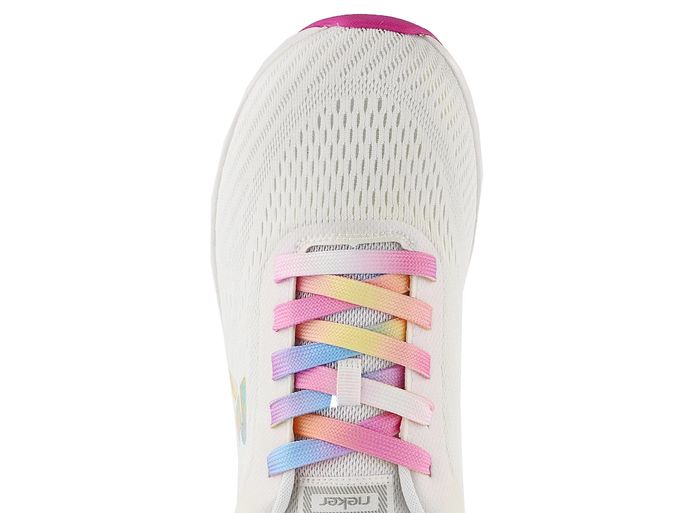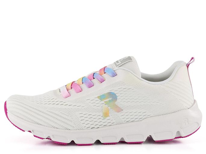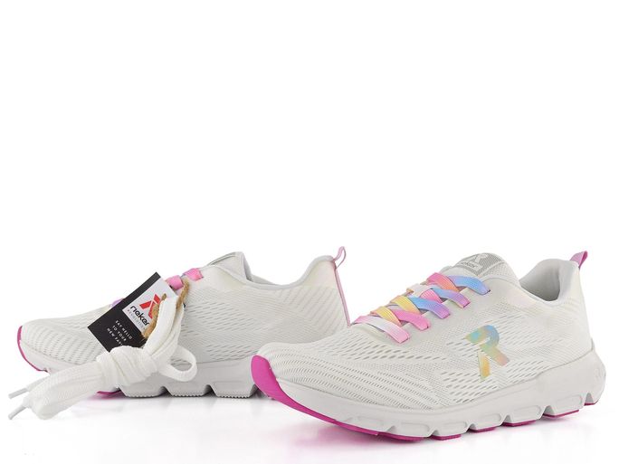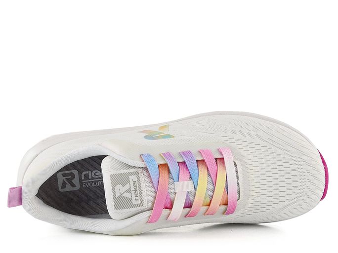 Lehké a designové dámské tenisky od značky Rieker z nové produktové řady R-EVOLUTION přináší maximální komfort a styl. Tyto tenisky jsou super lehké, neuvěřitelně měkké, pružné a pohodlné, ideální pro každodenní nošení. Svršek je vyroben z prodyšného textilního materiálu, který zajišťuje skvělou ventilaci. Elegantní bílý základ je doplněn duhovým logem a šněrováním, které dodává teniskám jedinečný vzhled. Součástí balení jsou i náhradní bílé tkaničky. Vnitřní textilní podšívka a příjemně měkká, vyjímatelná stélka s podporou podélné nožní klenby zaručují pohodlí při každém kroku. Velmi lehká a flexibilní podešev s latexovým nášlapem dokonale tlumí nárazy. Výška podpatku je 3,5 cm, což poskytuje ideální rovnováhu mezi pohodlím a stylem. Tento model je ideální volbou pro každou ženu, která hledá kvalitní a pohodlnou obuv na jaro a léto.