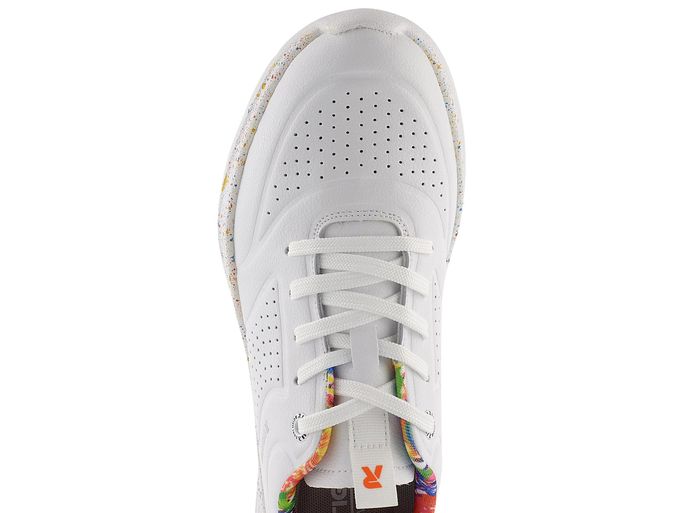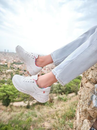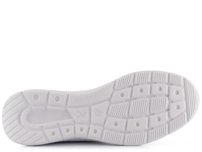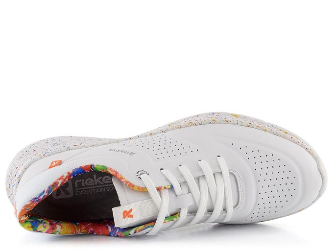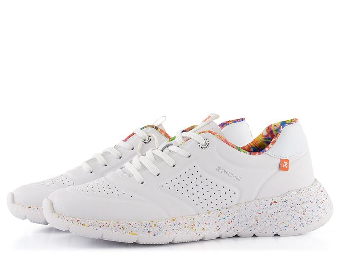 Lehké a stylové dámské tenisky od značky Rieker přinášejí dokonalou kombinaci pohodlí a moderního designu. Tyto tenisky z nové produktové řady R-EVOLUTION jsou neuvěřitelně lehké, měkké a pružné, což zajišťuje maximální komfort při každém kroku. Svršek je vyroben z hladké kůže v bílé barvě, s perforací na špičce a bocích pro lepší prodyšnost. Klasické šněrování umožňuje snadné a pohodlné nazouvání. Uvnitř se nachází pestrobarevná textilní podšívka a měkká, vyjímatelná stélka s textilním potahem, zesílenou patní zónou a podporou podélné nožní klenby. Ultralehká sportovní podešev s barevným nástřikem dodává teniskám jedinečný vzhled. Díky lepenému výrobnímu způsobu jsou tyto tenisky odolné a trvanlivé. Ideální volba pro jarní a letní sezónu.