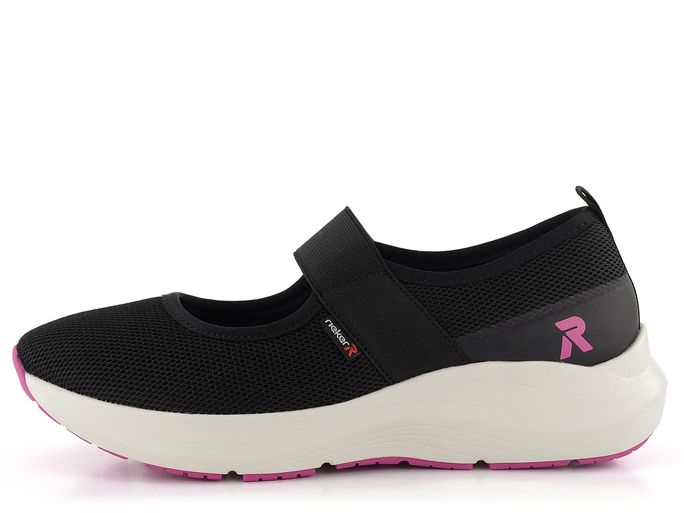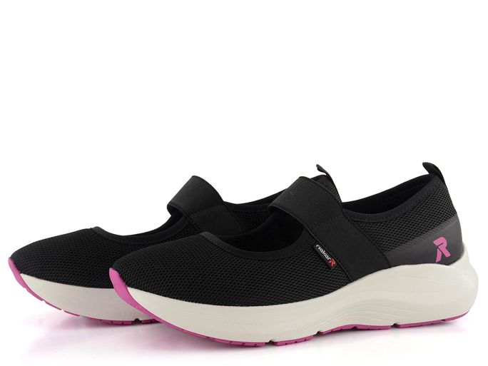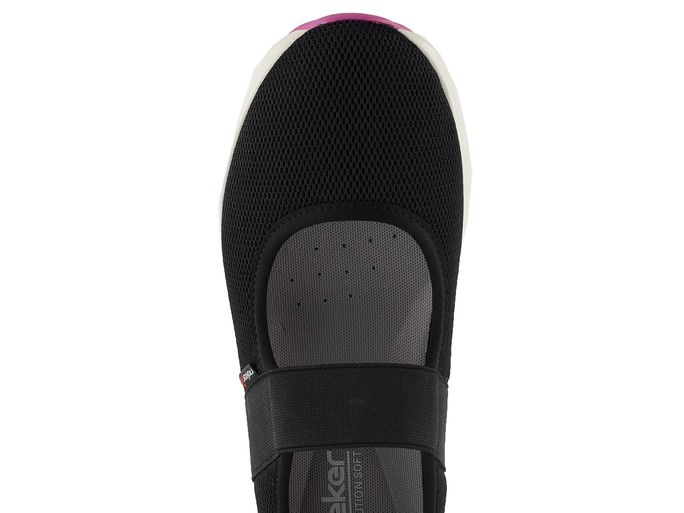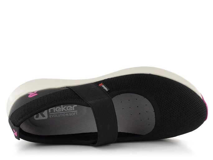 Dámské sportovní baleríny od značky Rieker kombinují komfort a styl v lehkém provedení. Tyto baleríny z nové řady R-EVOLUTION jsou neuvěřitelně měkké, pružné a pohodlné. Svršek je vyroben z prodyšné mřížkované textilie s pogumovanou patou a černou barvu doplňují růžové detaily. Pružný nártový pásek zajišťuje bezpečné a pohodlné nošení.