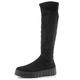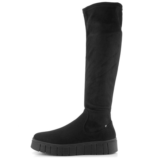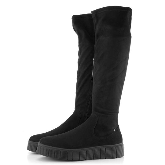 Pohodlné dámské textilní kozačky na vysoké platformě, střižené pro úzké lýtko.