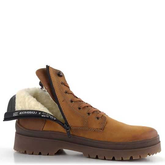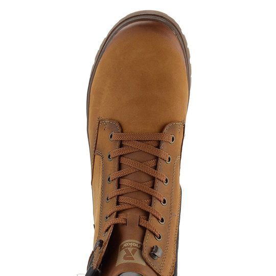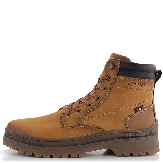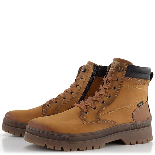 Kvalitní pánské kotníkové boty v pohorkovém stylu od značky Rieker Revolution jsou ideální volbou pro chladné podzimní a zimní dny. Tento model se vyznačuje svrškem z nubukové kůže v koňakové hnědé barvě se stínováním, což dodává botám elegantní vzhled. Komfort při nošení zajišťuje hustá střižní podšívka a vyjímatelná měkká stélka s termoizolační fólií. Boty mají prostornou kulatou špičku, šněrování s kovovými očky a horním háčkem, což spolu s postranním zipem usnadňuje obutí. Vysoká latexová podešev s hrubým vzorkem poskytuje skvělou přilnavost i na kluzkém povrchu. Funkční vodoodpudivá membrána R-TEX® zaručuje suché nohy za každého počasí. Výška kotníku 13 cm (bez podešve) a černá prošívaná bandáž okolo kotníku dodávají botám nejen styl, ale i extra stabilitu. Tento model je vyroben lepeným způsobem, což zajišťuje jeho dlouhou životnost a odolnost.