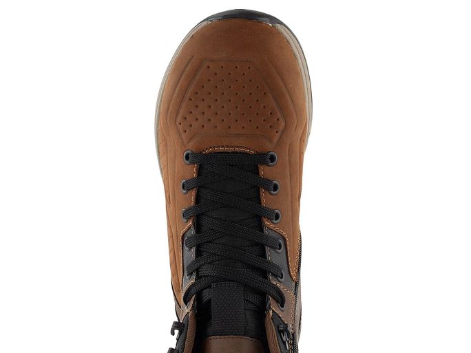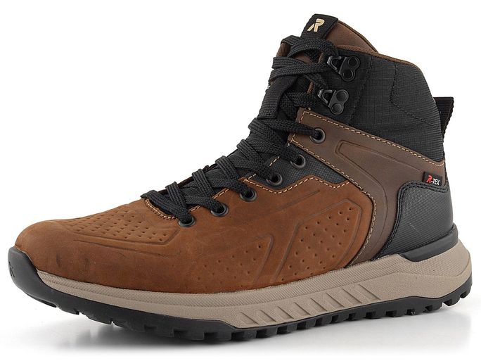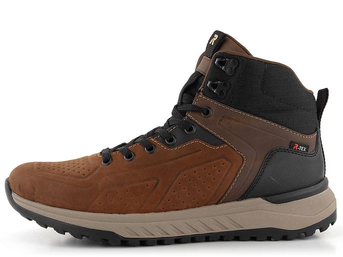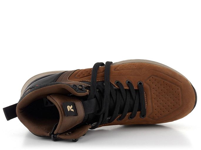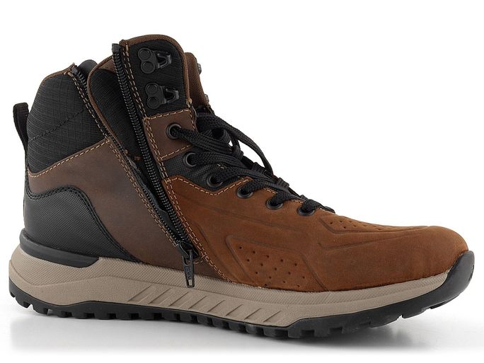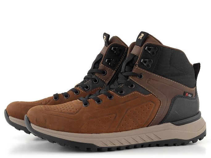 Pro podzimní a zimní sezónu nabízíme pánské kotníkové boty od značky Rieker. Tento model je součástí nové řady R-EVOLUTION, která se vyznačuje super lehkostí, měkkostí a pohodlím. Boty jsou vyrobeny z kombinace nubukové a hladké kůže spolu s textilií, což zajišťuje jejich odolnost a stylový vzhled v odstínech hnědé s černými doplňky.