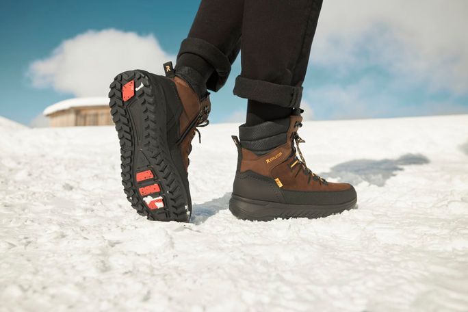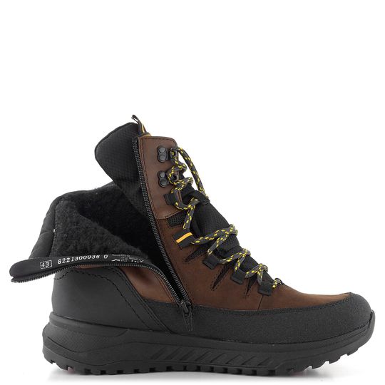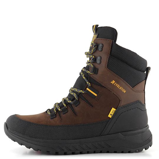 Pánské zimní kotníkové boty od značky Rieker jsou ideální volbou pro podzimní a zimní sezónu. Tento model z nové řady R-EVOLUTION je navržen tak, aby poskytoval maximální pohodlí a funkčnost. Svršek je vyroben z kvalitní nubukové kůže, syntetiky a textilie a kombinace tmavě hnědé a černé barvy s žlutými doplňky dodává botám moderní vzhled.