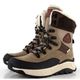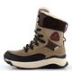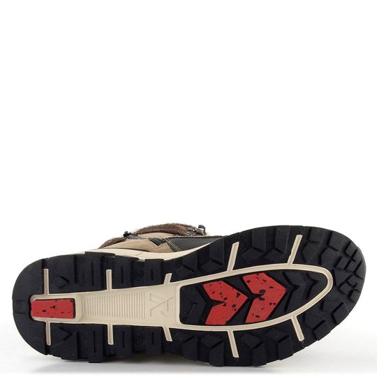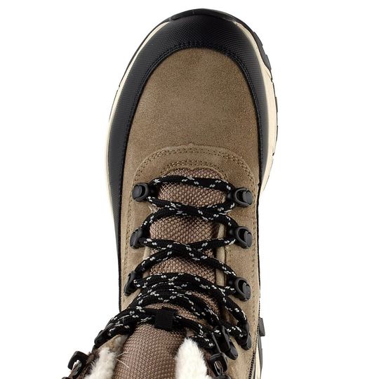 Boty jsou laděny v hnědých a béžových odstínech s kontrastními černými doplňky. Šněrování s kovovými očky a horními dvěma háčky zajišťuje pevné uchycení, zatímco zip na vnitřní straně usnadňuje obutí. Silně polstrovaný kotníkový lem a jazyk poskytují maximální pohodlí.