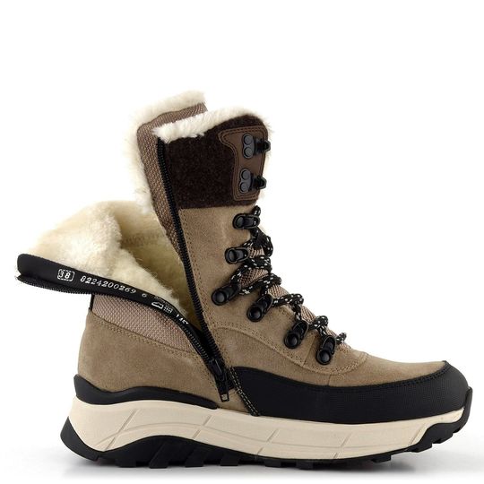 Podšívka ze střižní ovčí vlny a kotníkový lem z hebkého umělého kožíšku udržují nohy v teple. Vyjímatelná pěnová stélka s vlněným potahem, termoizolační fólií a patním absorbérem zvyšuje komfort. Boty jsou vybaveny vodoodpudivou membránou R-TEX® a sportovní lehká podešev s hrubým vzorkem a protiskluzovými gripy zajišťuje bezpečný krok. Výška podpatku je 4,5 cm a výška kotníku 15 cm (bez podešve).