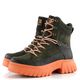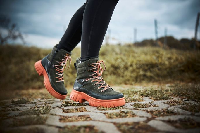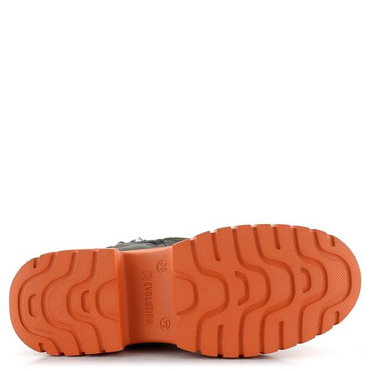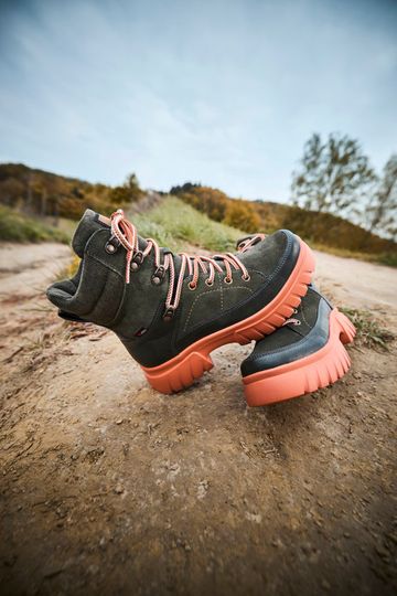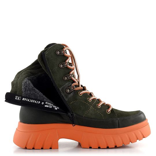 Stylové dámské zimní kotníkové boty od značky Rieker vás okouzlí svým netradičním designem a maximálním komfortem. Boty z nové řady R-EVOLUTION jsou lehké, měkké a pružné, což zaručuje pohodlné nošení po celý den. Kombinace semišové kůže, jemně strukturované syntetiky a textilie v khaki zelené barvě s oranžovými doplňky dodává botám jedinečný vzhled. Praktické šněrování s kovovými očky a postranní zip usnadňují obutí. Vnitřní teplá filcová podšívka a měkká vyjímatelná stélka s patním absorbérem zaručují pohodlí i v chladném počasí. Boty jsou vybaveny vodoodpudivou membránou R-TEX® a vysokou hrubou latexovou podešví. Výška podpatku je 4,5 cm a výška kotníku 12,5 cm.