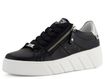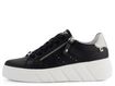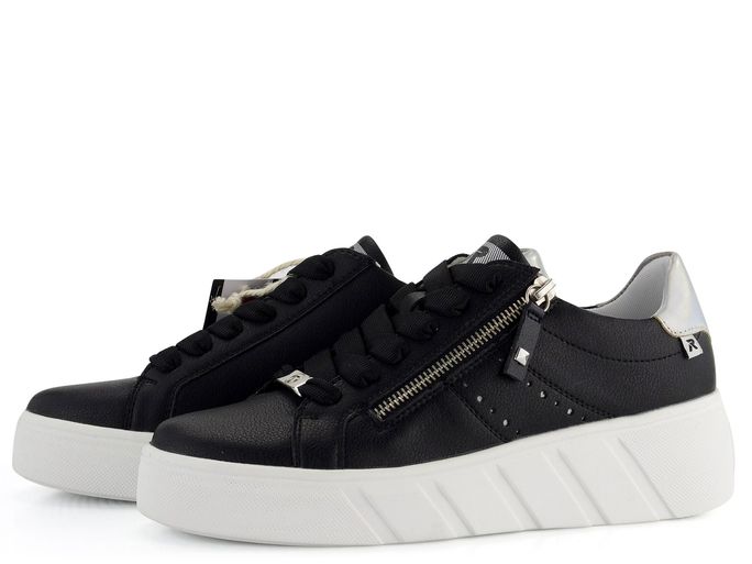 Stylové a pohodlné dámské tenisky od značky Rieker z nové produktové řady R-EVOLUTION. Tyto černé tenisky jsou vyrobeny z hladké povrstvené kůže a mají pěknou kulatou špičku. Klasické šněrování s plochými tkaničkami je doplněno o postranní zip, který usnadňuje obutí. Duhový metalický doplněk na patě dodává teniskám moderní vzhled.