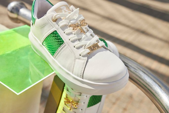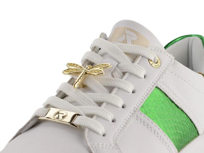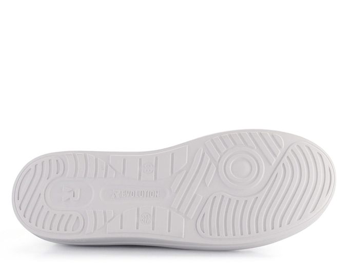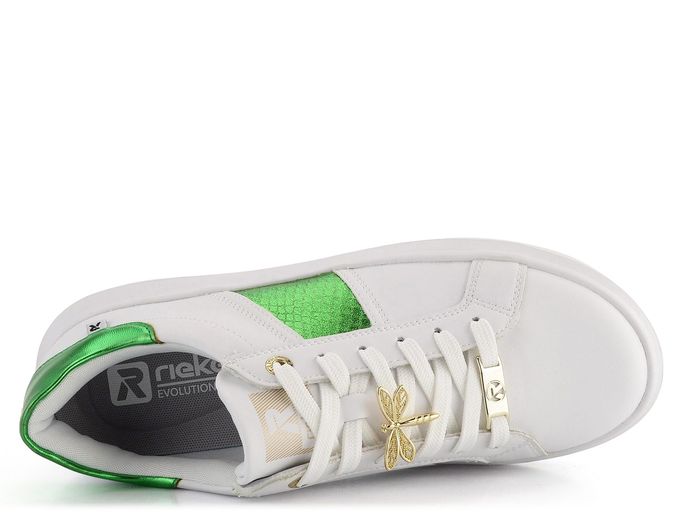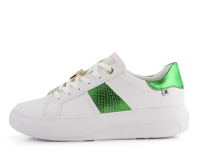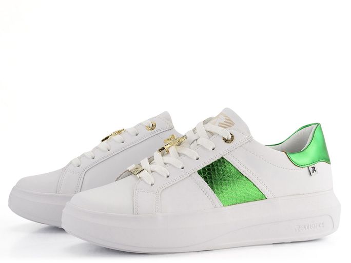 Stylové a extra pohodlné dámské kožené tenisky od značky Rieker Revolution jsou ideální volbou pro všechny, kdo hledají kvalitu a design. Tyto tenisky z nové produktové řady R-EVOLUTION vynikají svou lehkostí, měkkostí a pružností. Svršek z hladké povrstvené kůže v bílé barvě s metalickým zeleným doplňkem na patě a boku dodává botám moderní vzhled.