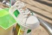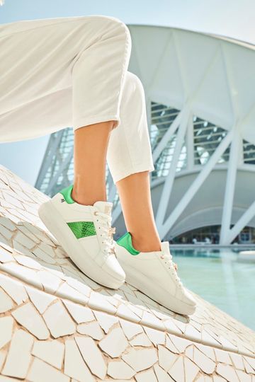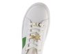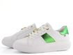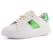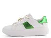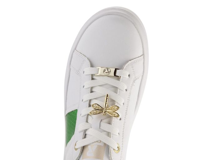 Dámské bílé kožené tenisky na vysoké módní platformě, oživené metalickou zelenou barvou a kovovou broží na tkaničkách.