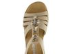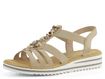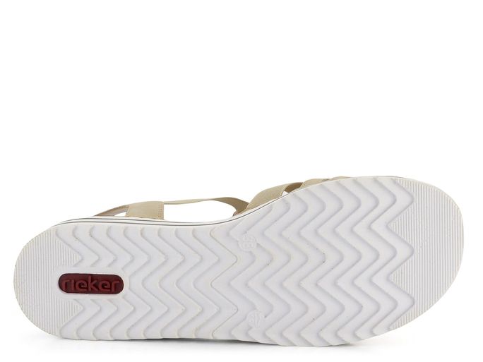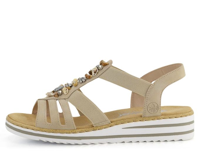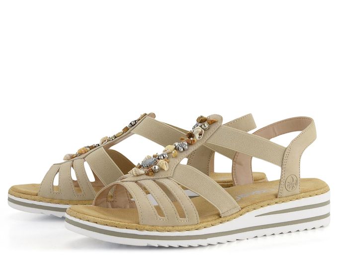 Elegantní a pohodlné dámské páskové sandálky od značky Rieker jsou ideální volbou pro jarní a letní sezónu. Tyto sandály v béžové barvě s jemným šedým nádechem se snadno obouvají díky pruženkám na obou stranách. Svršek je vyrobený z matné syntetiky, zatímco vnitřní strana pásků je z hladké syntetiky. Nárt zdobí aplikace z bižuterních kamenů, korálků a mušliček, což dodává sandálům jedinečný vzhled. Příjemně měkká stélka potažená broušenou textilií zajišťuje komfort při každém kroku. Pevná syntetická podešev na mírném klínku o výšce 3,5 cm v bílém provedení s šedými linkami je ideální pro každodenní nošení. Tyto sandály jsou dokonalou kombinací stylu a pohodlí.