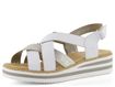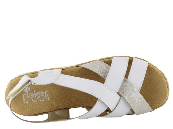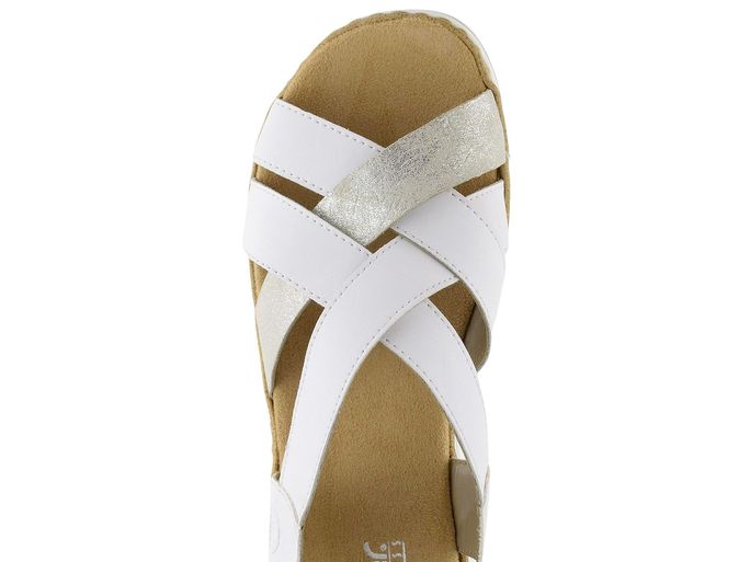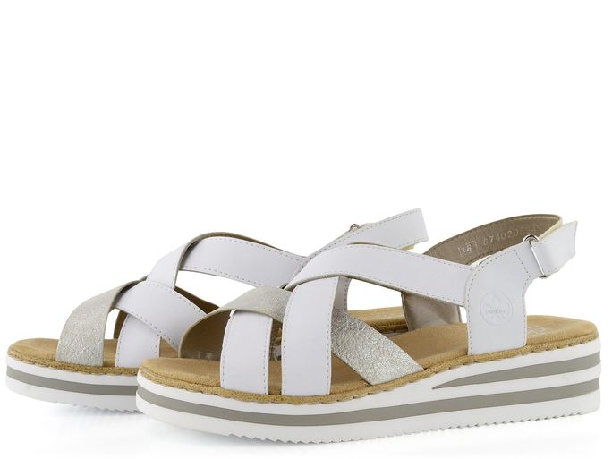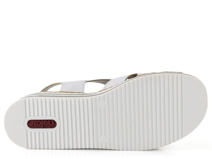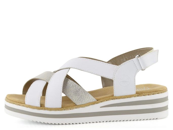 Dámské sandály na klínku od značky Rieker kombinují eleganci a pohodlí. Jsou ideální pro jarní a letní sezónu. Svršek je vyroben z kombinace hladké kůže a syntetiky, což zajišťuje dlouhou životnost a stylový vzhled. Bílá barva je doplněna stříbrným metalickým páskem, který dodává sandálům moderní nádech. Pásky se efektně kříží na nártu a patní pásek je upínaný na suchý zip, což usnadňuje obouvání. Vnitřní strana pásků je syntetická, což zajišťuje pohodlí při nošení. Příjemně měkká stélka potažená broušenou textilií poskytuje maximální komfort. Podešev s mírným klínkem má šedostříbrné proužky a dodává botám elegantní vzhled. Tyto sandály jsou ideální volbou pro každodenní nošení i formálnější příležitosti.