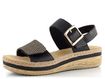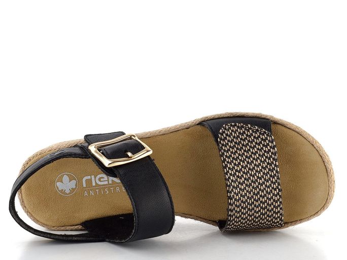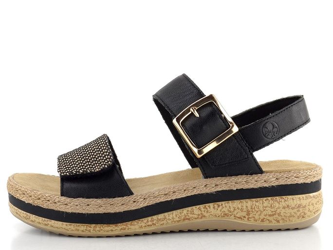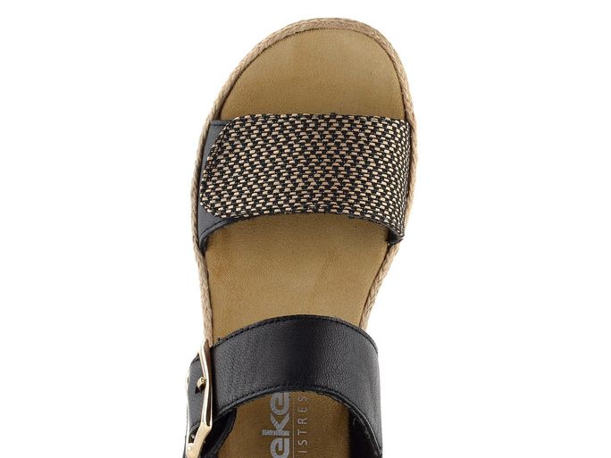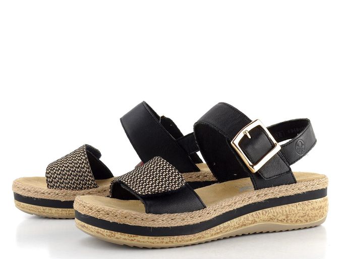 Představujeme vám dámské sandály od značky Rieker, které se stanou vaším nepostradatelným společníkem pro jarní a letní dny. Tyto sandály jsou navrženy pro ženy, které ocení pohodlí a styl v jednom. Široké upínací pásky a mírný klínek poskytují stabilitu a komfort při chůzi. Kombinace hladké kůže a vytkávané textilie v černé barvě s přírodními béžovými a stříbrnými detaily dodává elegantní vzhled. Suchý zip usnadňuje nazouvání, zatímco měkká stélka zajišťuje pohodlí po celý den. Platforma je zdobena černou linkou a jutovým opletem, což podtrhuje moderní design. Tyto sandály jsou ideální volbou pro městské procházky i pracovní dny v kanceláři.
