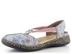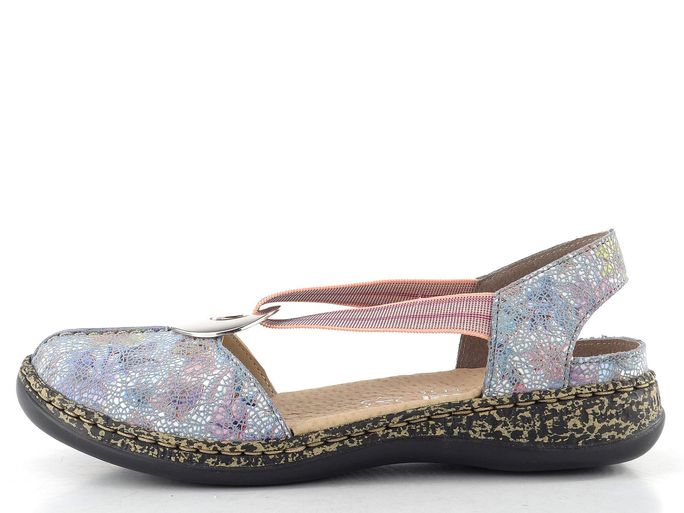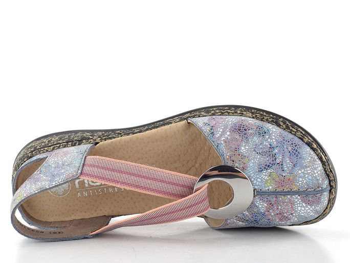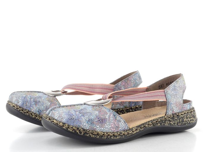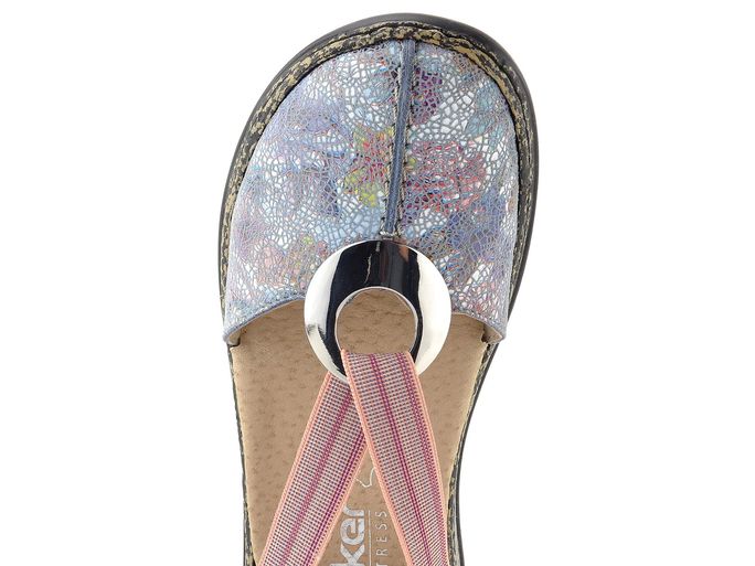 Dámské sandály značky Rieker představují ideální volbu pro jarní a letní dny. Tyto sandálky se pyšní prostorným kulatým střihem, který zajišťuje pohodlné nošení po celý den. Vyrobeny jsou z jemně zabroušené kůže v modrošedé barvě s barevným lesklým potiskem, jehož dominantními barvami jsou červená, růžová, zelená a tmavě modrá.
