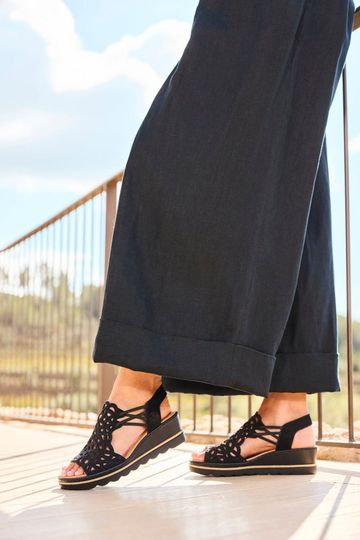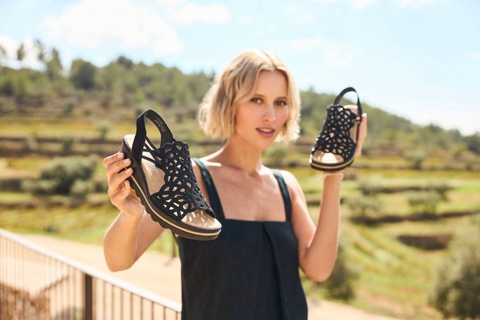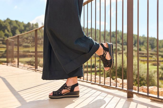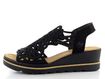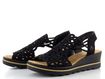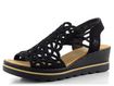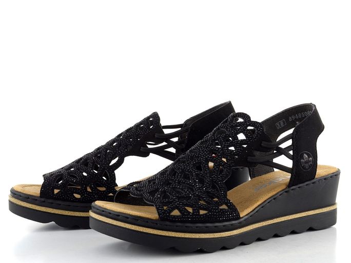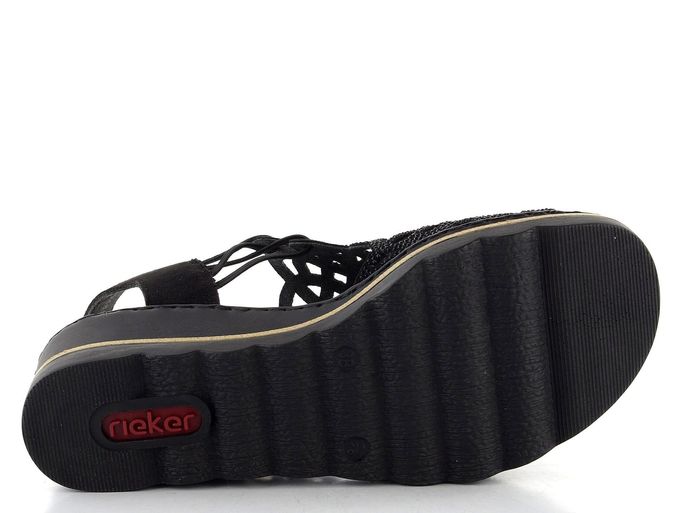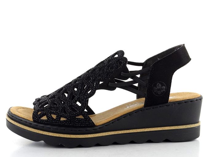 K letním dnům neodmyslitelně patří stylové a pohodlné sandály. Černé sandály s klínkem od značky Rieker jsou ideální volbou pro ty, kteří hledají elegantní a zároveň komfortní obuv. S výškou podpatku 5 cm poskytují nejen potřebnou stabilitu, ale i elegantní vzhled. Textilní svršek je zdoben drobnými blyštivými kamínky a široký nártový pásek je prořezávaný do vzoru, což dodává botám jedinečný design. Díky pruženkám po stranách je obutí snadné a rychlé. Měkká stélka potažená broušenou textilií zaručuje pohodlí i při delším nošení. Syntetická platforma s černým potaženým klínkem a vlnkovitý vzorek podešve dokonale doplňují celkový vzhled.