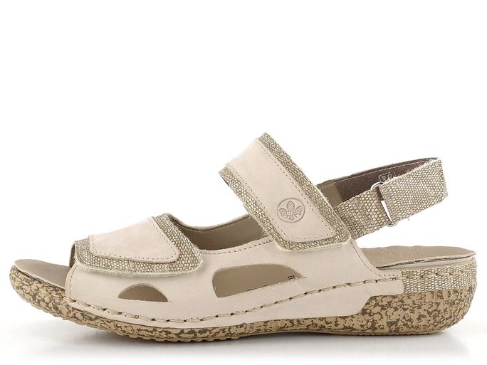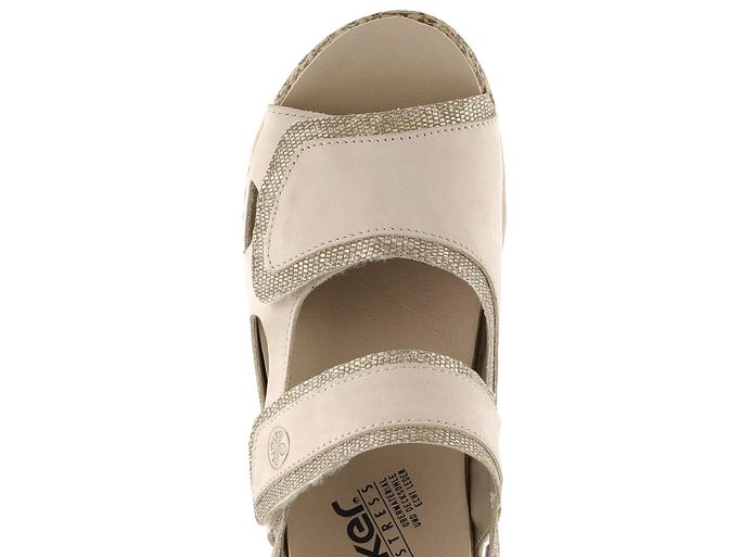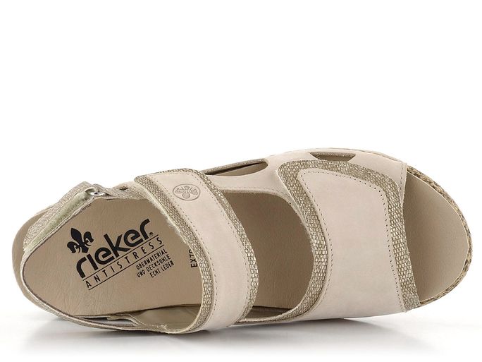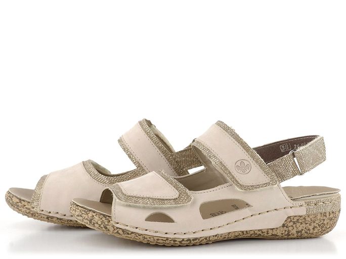 Představujeme vám dámské sandály značky Rieker, které vynikají svým komfortem a stylovým designem. Tyto sandály jsou ideální volbou pro širší typ chodidla, díky regulovatelné šíři pro typ G 1/2 až H. Svršek je vyroben z kvalitní nubukové kůže v kombinaci se syntetikou, což zaručuje dlouhou životnost a pohodlí při nošení. Béžová barva s metalickým zlatavým odstínem dodává sandálům elegantní vzhled, který se hodí k jakémukoli letnímu outfitu.