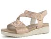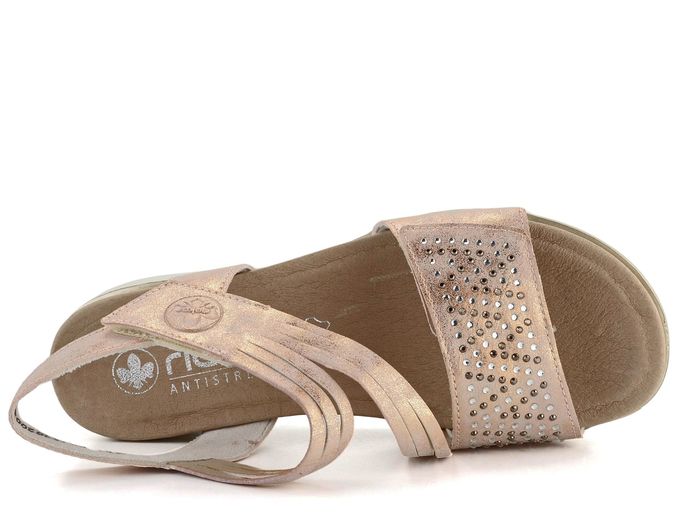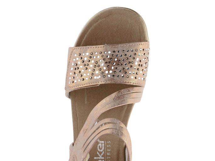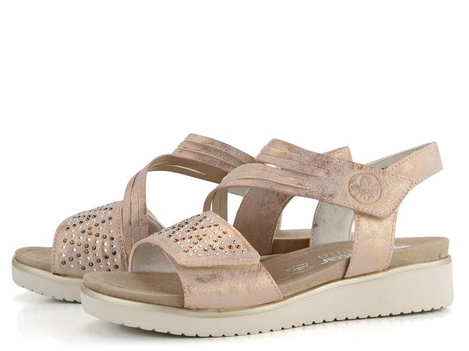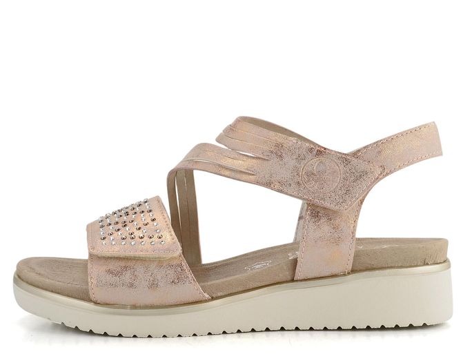 Hledáte stylové a pohodlné sandály na jaro a léto? Sandály značky Rieker v růžové barvě se zlatým metalickým leskem jsou ideální volbou. Díky prostornému kulatému střihu a měkké kožené stélce poskytují maximální pohodlí. Přední pásek je vykládaný broušenými kamínky v čiré a tmavě šedé barvě, což dodává sandálům elegantní vzhled. Svršek je vyrobený z hladké syntetiky, zatímco podšívka kombinuje kůži a textilii pro ještě větší komfort. Přední i nártový pásek jsou upínané na suchý zip, což umožňuje snadné obouvání a přizpůsobení. Lehká podešev s malým klínkem zajišťuje pohodlnou chůzi po celý den. S těmito sandály budete vypadat skvěle a cítit se ještě lépe.