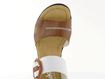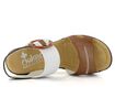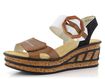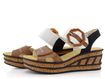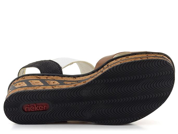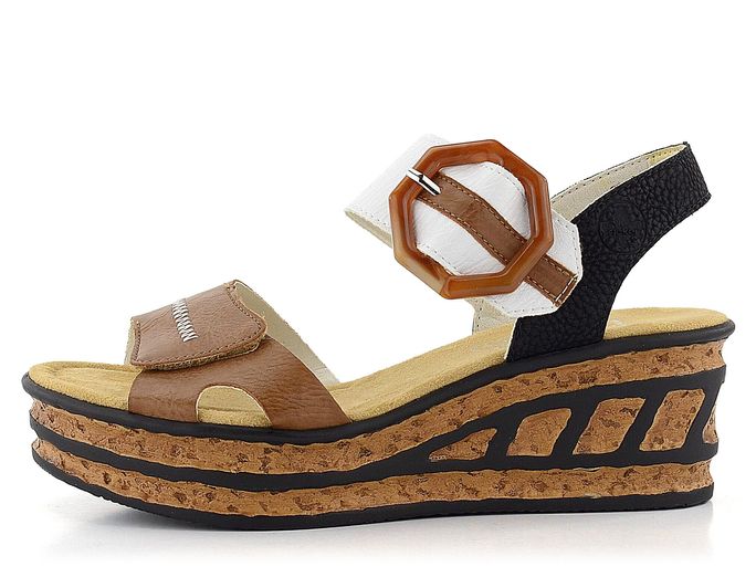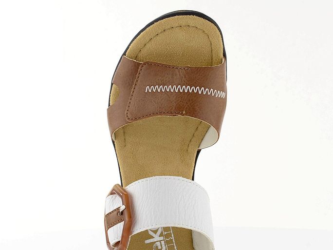 K letním dnům klínky prostě patří. Tyto sandály od značky Rieker vynikají zajímavou barevnou kombinací bílé, černé a hnědé kávové barvy. Svršek je vyroben ze syntetického materiálu, který je nejen odolný, ale i snadno udržovatelný. Dominantní plastová spona dodává sandálům jedinečný vzhled, zatímco přední a nártový pásek lze nastavit pomocí suchých zipů pro maximální pohodlí. Podšívka je ze syntetiky a měkká stélka, potažená broušenou textilií, zajistí komfort při každém kroku. Platforma s klínkem ve výšce 6,3 cm s dekorativními černými linkami a korkovým vzhledem podtrhuje moderní design. Sandály jsou navíc vyrobeny šitým způsobem, což zaručuje jejich trvanlivost. Perfektní volba pro každodenní nošení do města či na lehkou procházku.