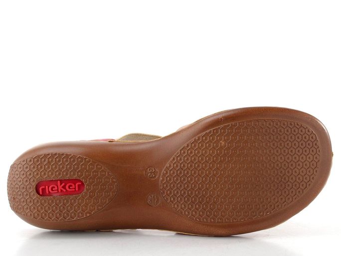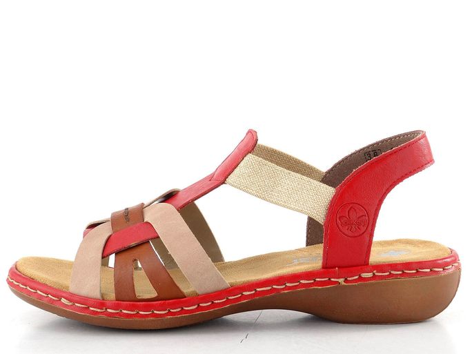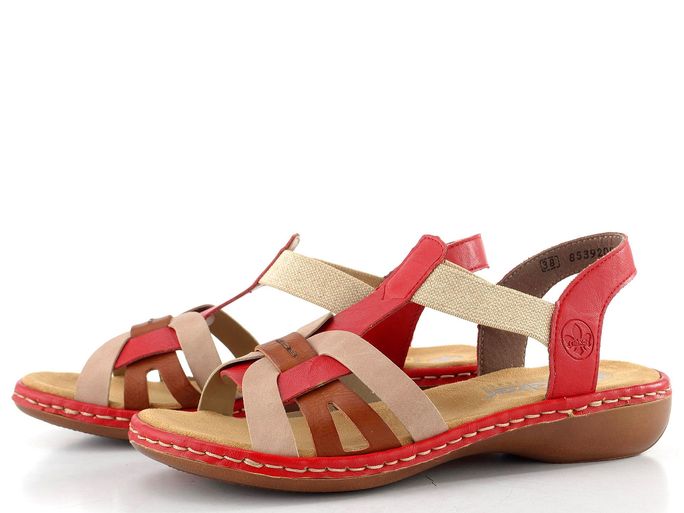 Dámské sandály od značky Rieker představují ideální volbu pro jarní a letní dny. Tyto pohodlné sandály v atraktivní béžovo-červené kombinaci se vyznačují prostorným střihem, který zajišťuje komfort při nošení. Svršek je vyroben z hladké syntetiky, zatímco podšívka z hladké syntetiky a měkká stélka potažená broušenou textilií skvěle saje vlhkost. Dvě široké pruženky po stranách nártu umožňují snadné obutí. Lehká syntetická podešev se zvýšenou patou o výšce 3,5 cm dodává stabilitu a pohodlí. Tyto sandály jsou skvělou volbou pro každodenní nošení do města i na příležitostné procházky.